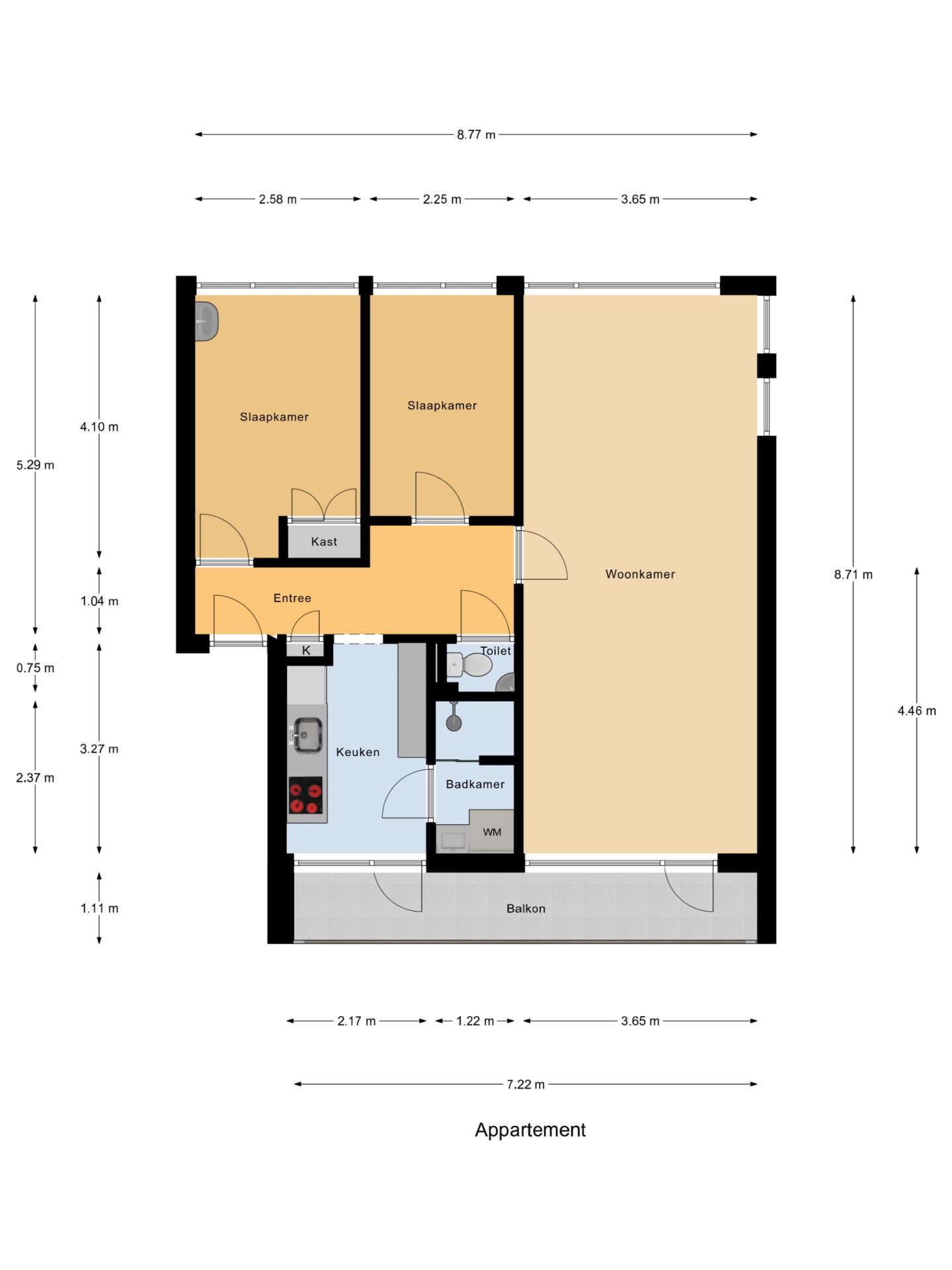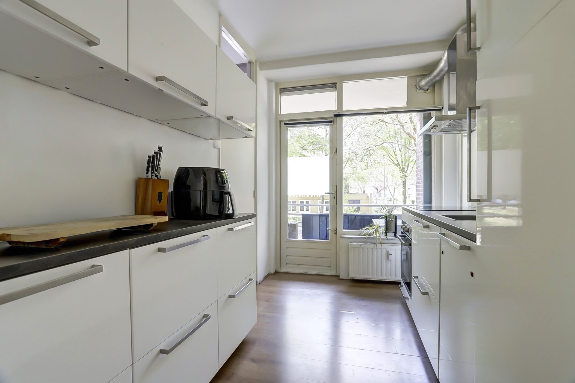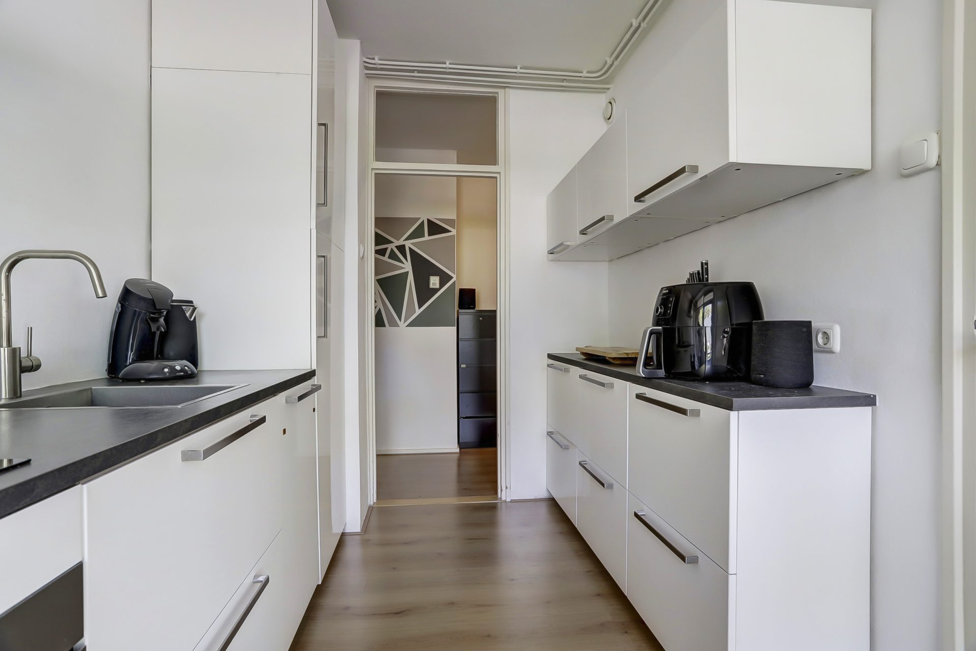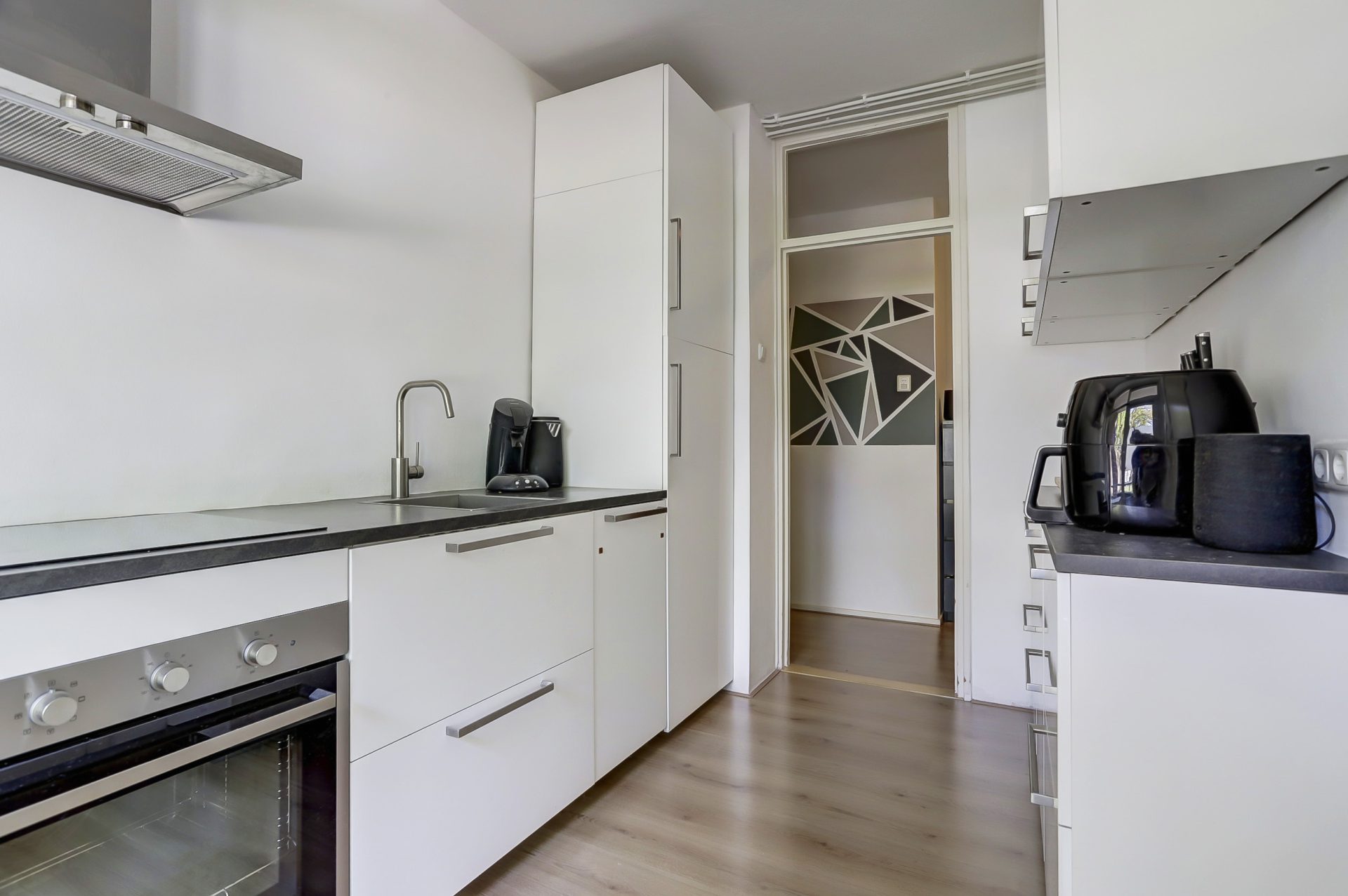 • Keuken: De separate keuken is praktisch ingericht en voorzien van een inductiekookplaat, afzuigkap, vaatwasser, heteluchtoven en een koelkast met vriesvak. De vloer is hier eveneens afgewerkt met laminaat. Vanuit de keuken heb je toegang tot de badkamer en tevens tot het balkon.
