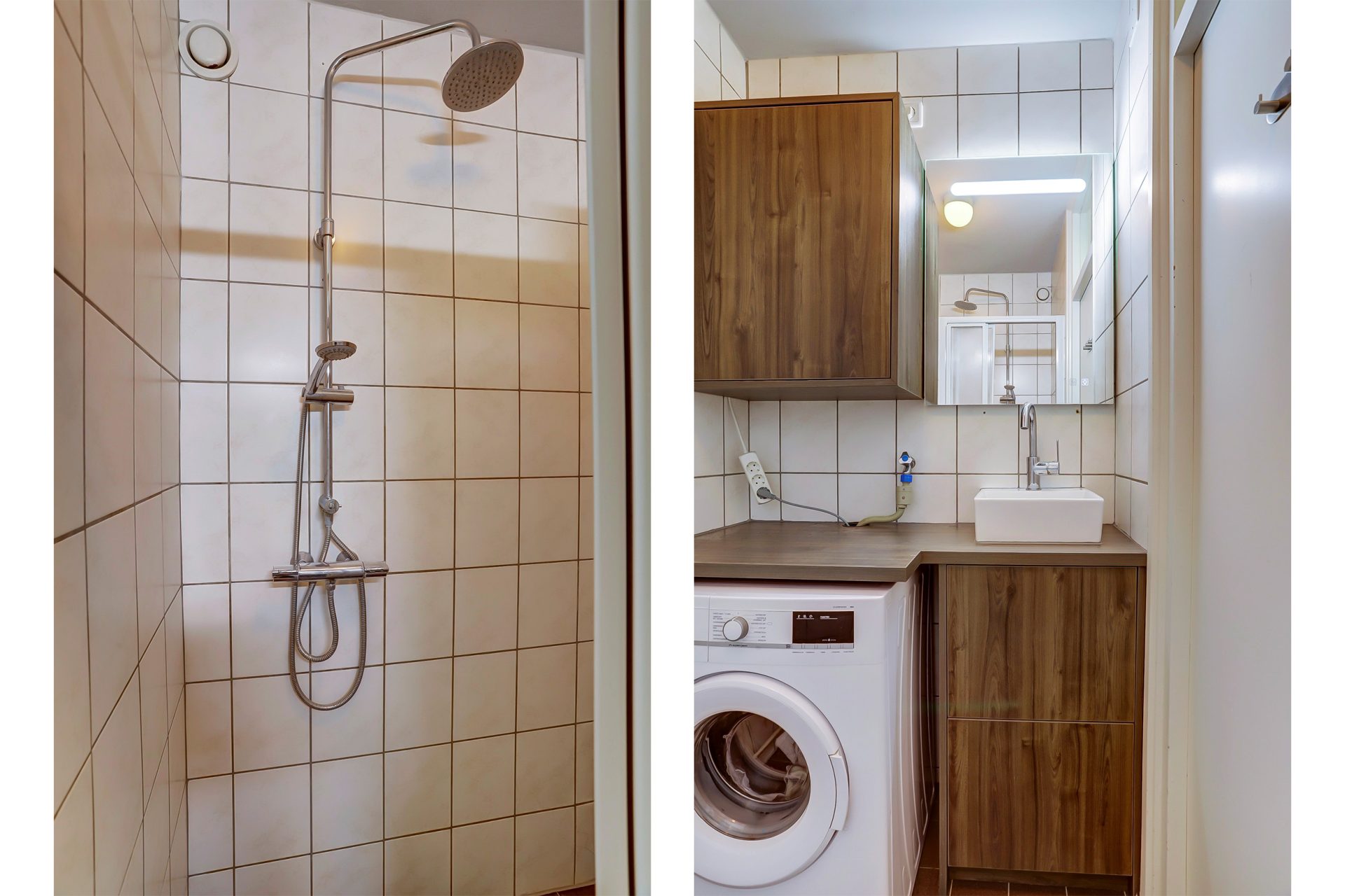 • Badkamer: De volledig betegelde badkamer is voorzien van een regendouche en een wastafelmeubel. Ook vind je hier de aansluitingen voor de wasmachine.