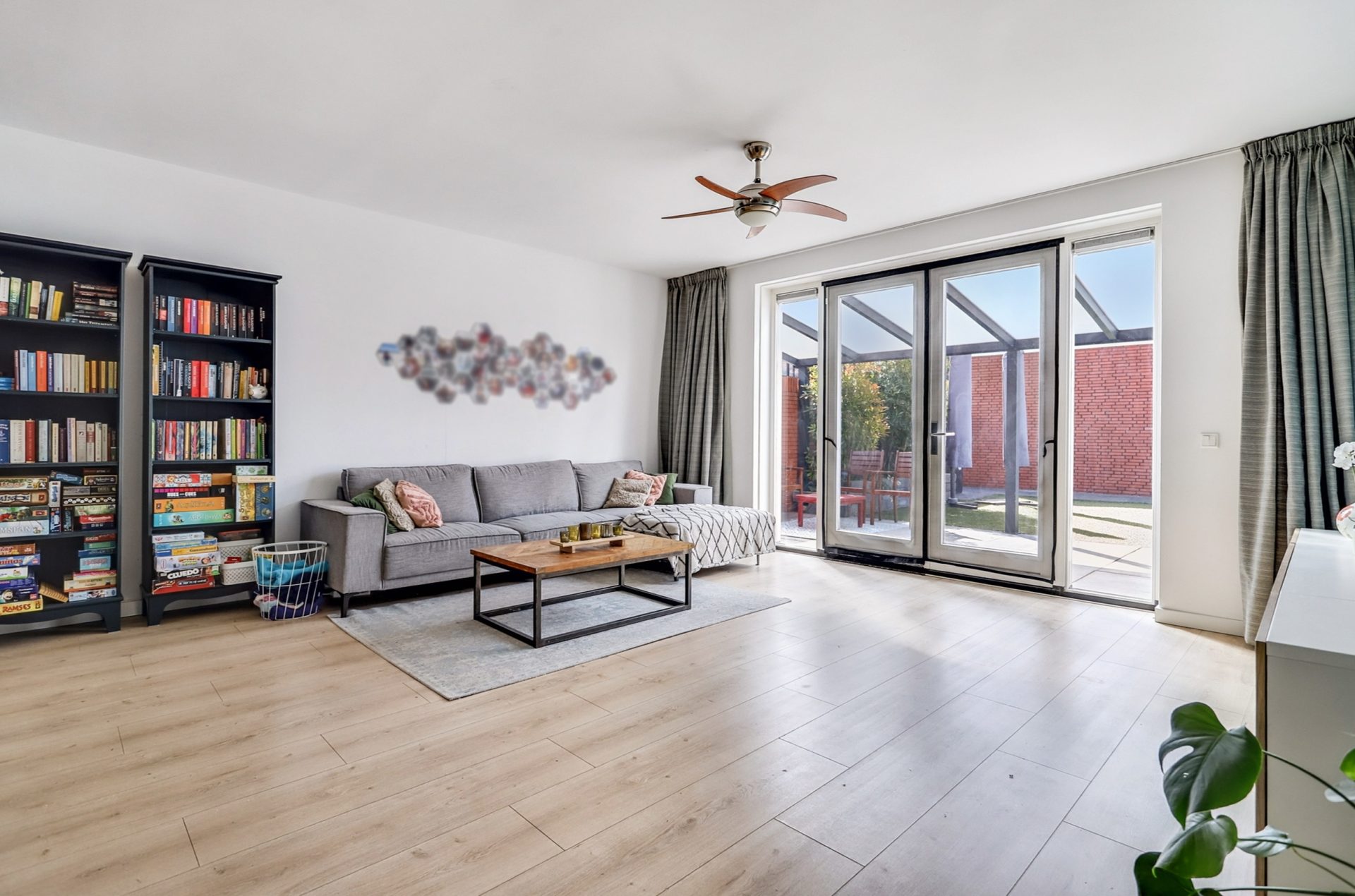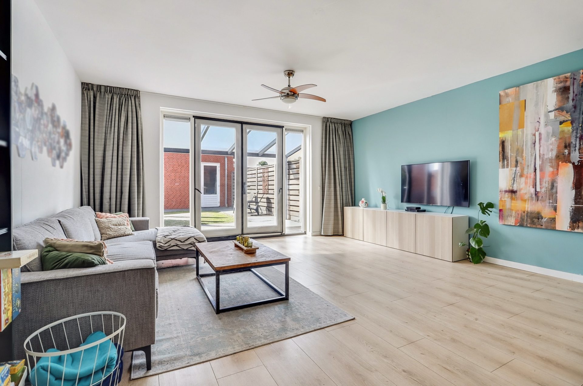 De lichte woonkamer is uitgebouwd en beschikt over een praktische voorraadkast onder de trap. Dankzij de grote ramen en openslaande tuindeuren valt er volop natuurlijk licht naar binnen.