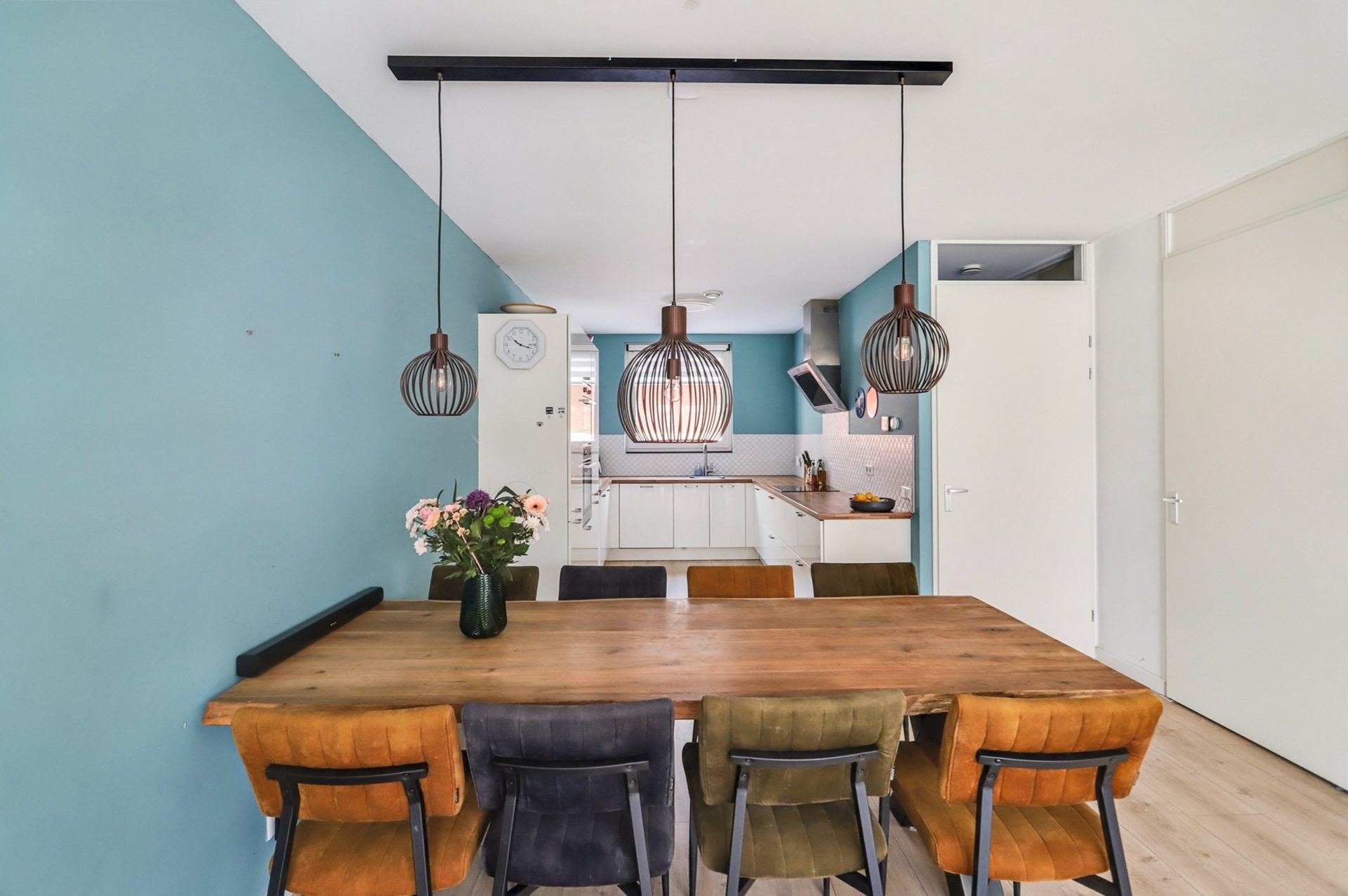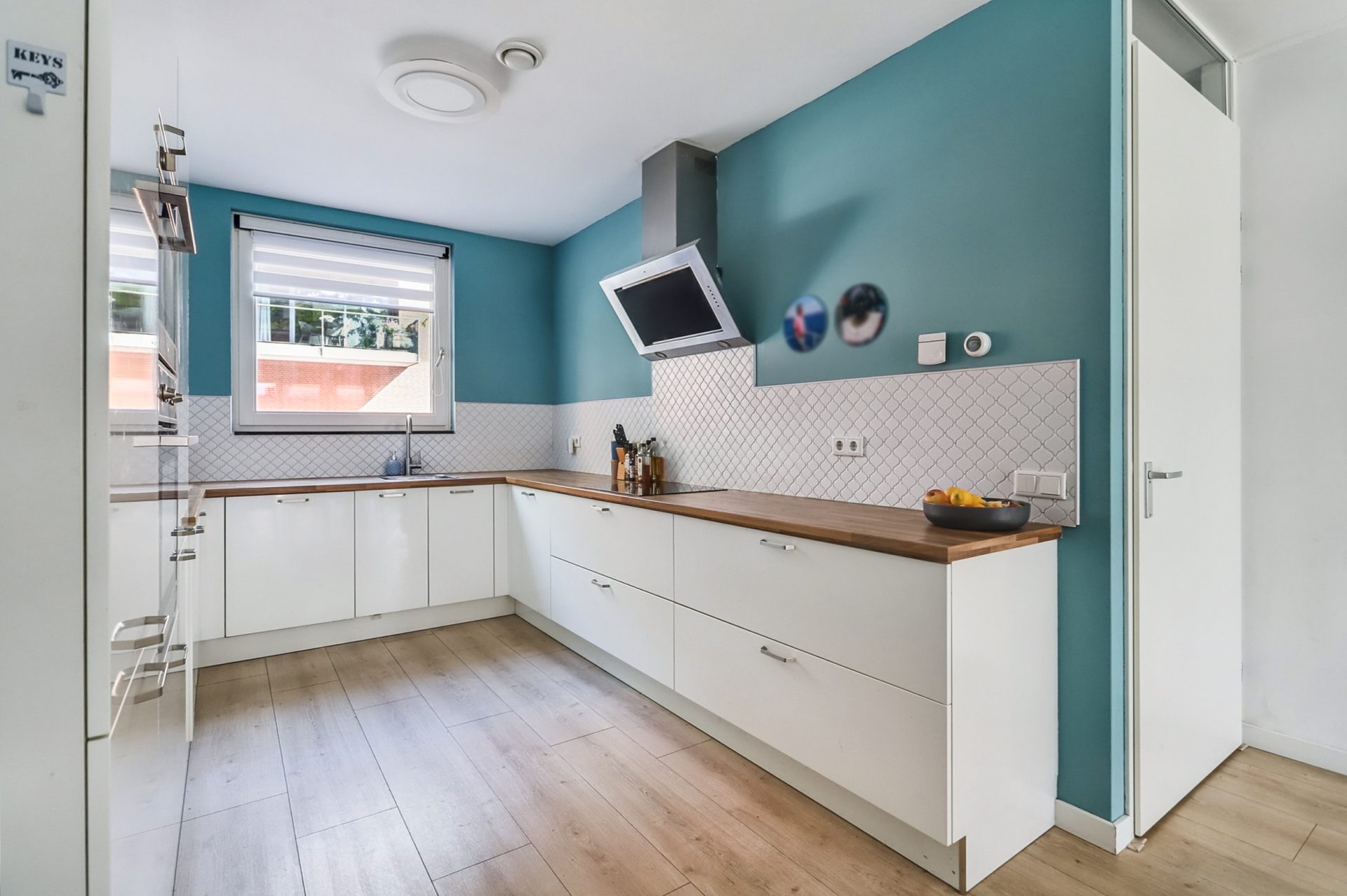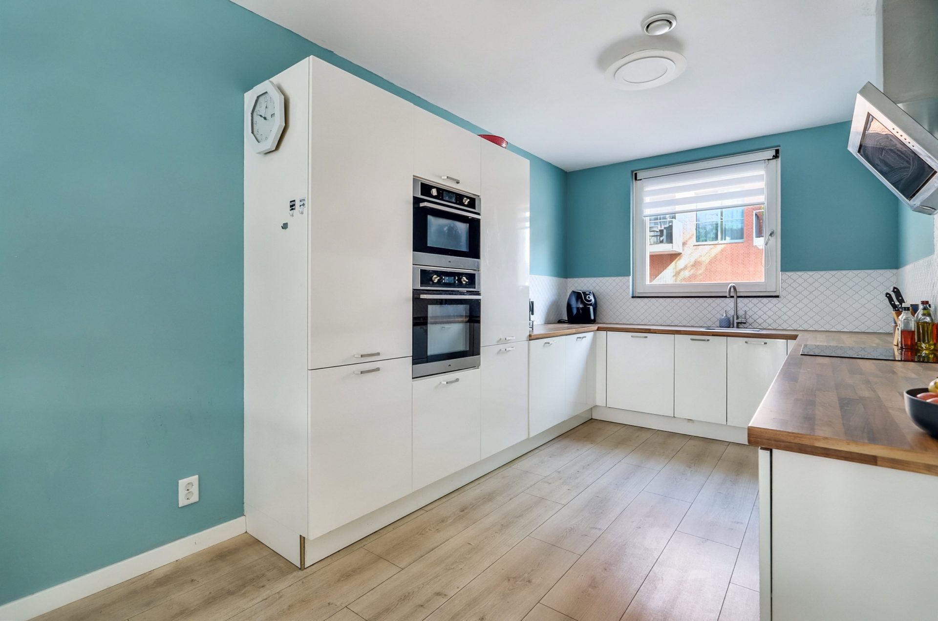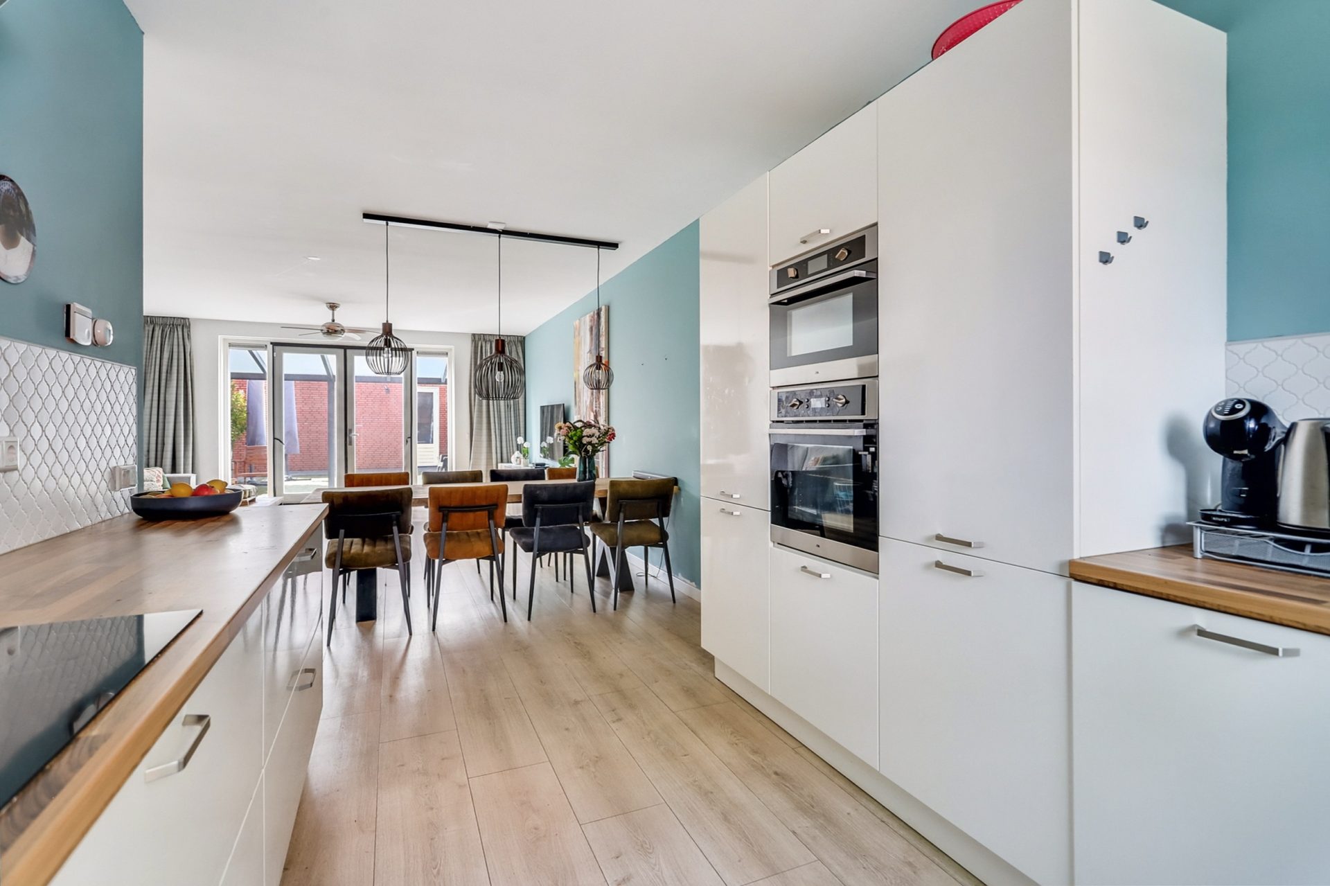 De open keuken vormt samen met de woonkamer een comfortabele en sfeervolle leefruimte. Dankzij de praktische U-vormige opstelling en de kastenwand met onder andere een inductiekookplaat, afzuigkap, vaatwasser, oven, magnetron, koelkast en vriezer, is de keuken van alle gemakken voorzien én biedt deze voldoende werkruimte voor de thuiskok.