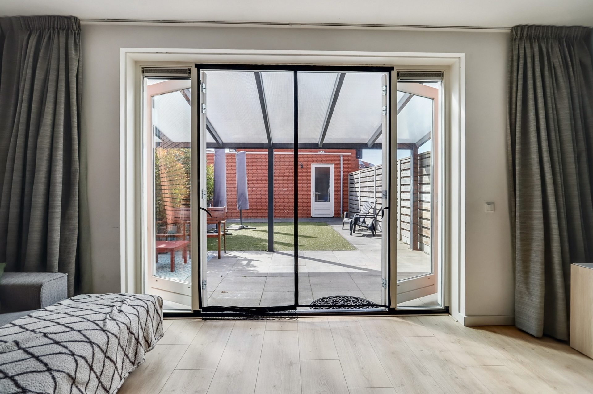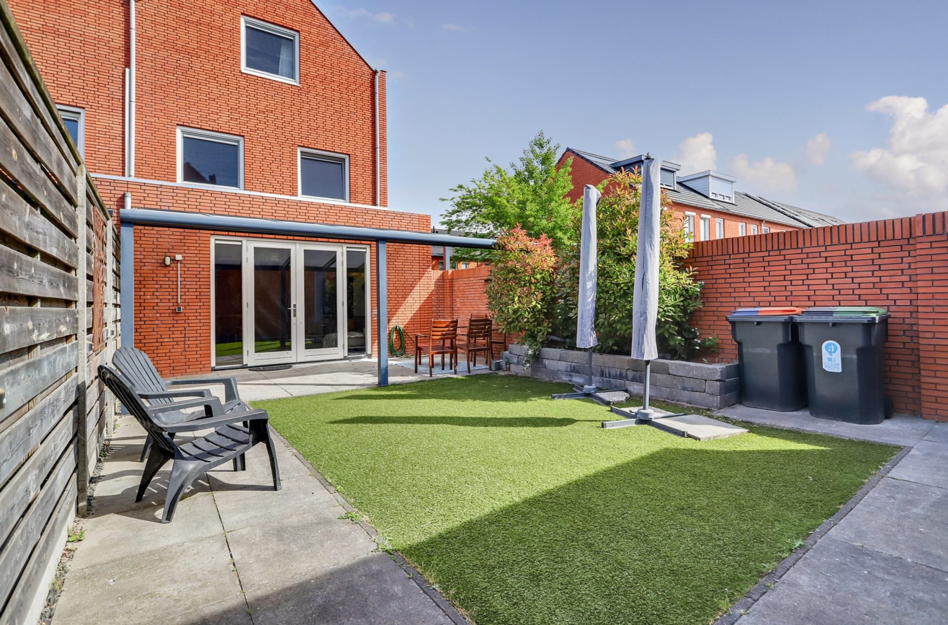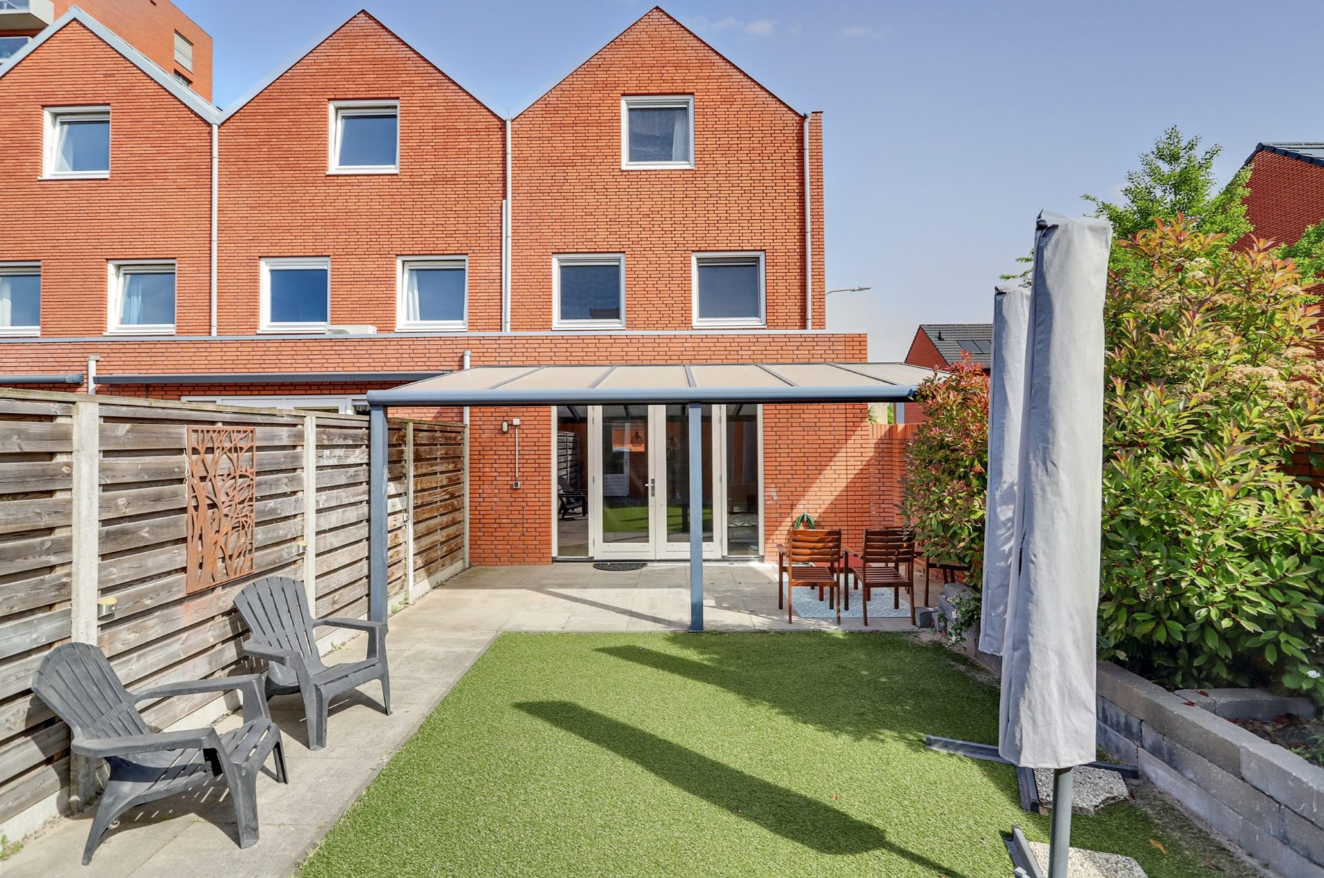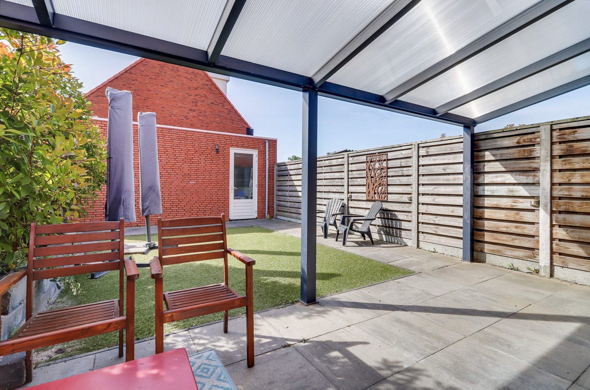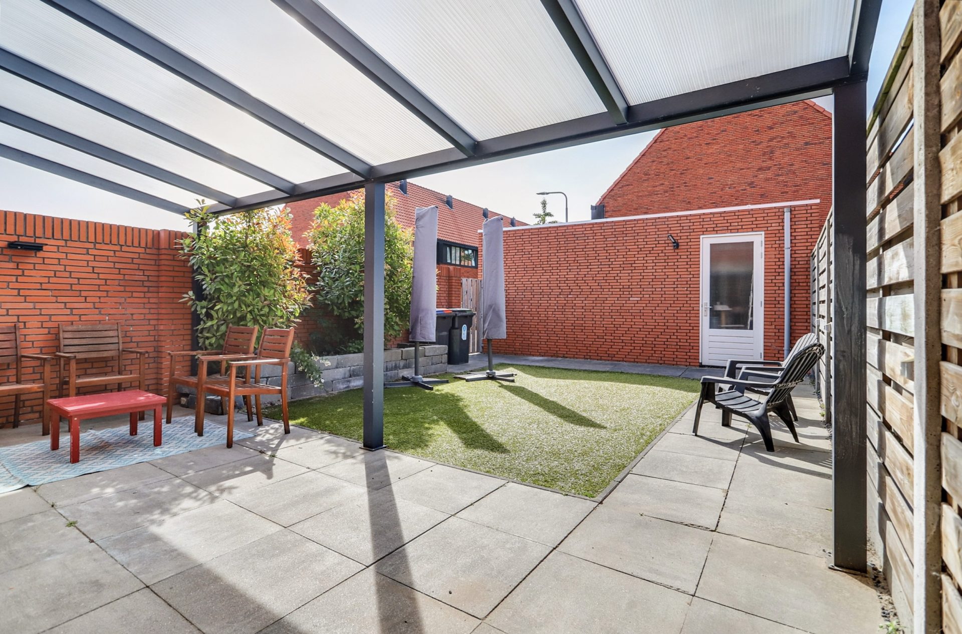 De tuin is gelegen op het zonnige zuidoosten, waardoor je hier de hele dag van de zon kunt genieten. Dankzij de ruime, moderne overkapping kun je zelfs bij regen comfortabel buiten zitten. Er is volop ruimte voor een gezellige loungeset. De tuin is voorzien van onderhoudsvriendelijk kunstgras en een plantenbak met groen. Via de tuin heb je toegang tot de eigen, separate garage van circa 18 m², die via een garagedeur uitkomt op de straat. De tuin is ook via een poort aan de straatzijde toegankelijk.