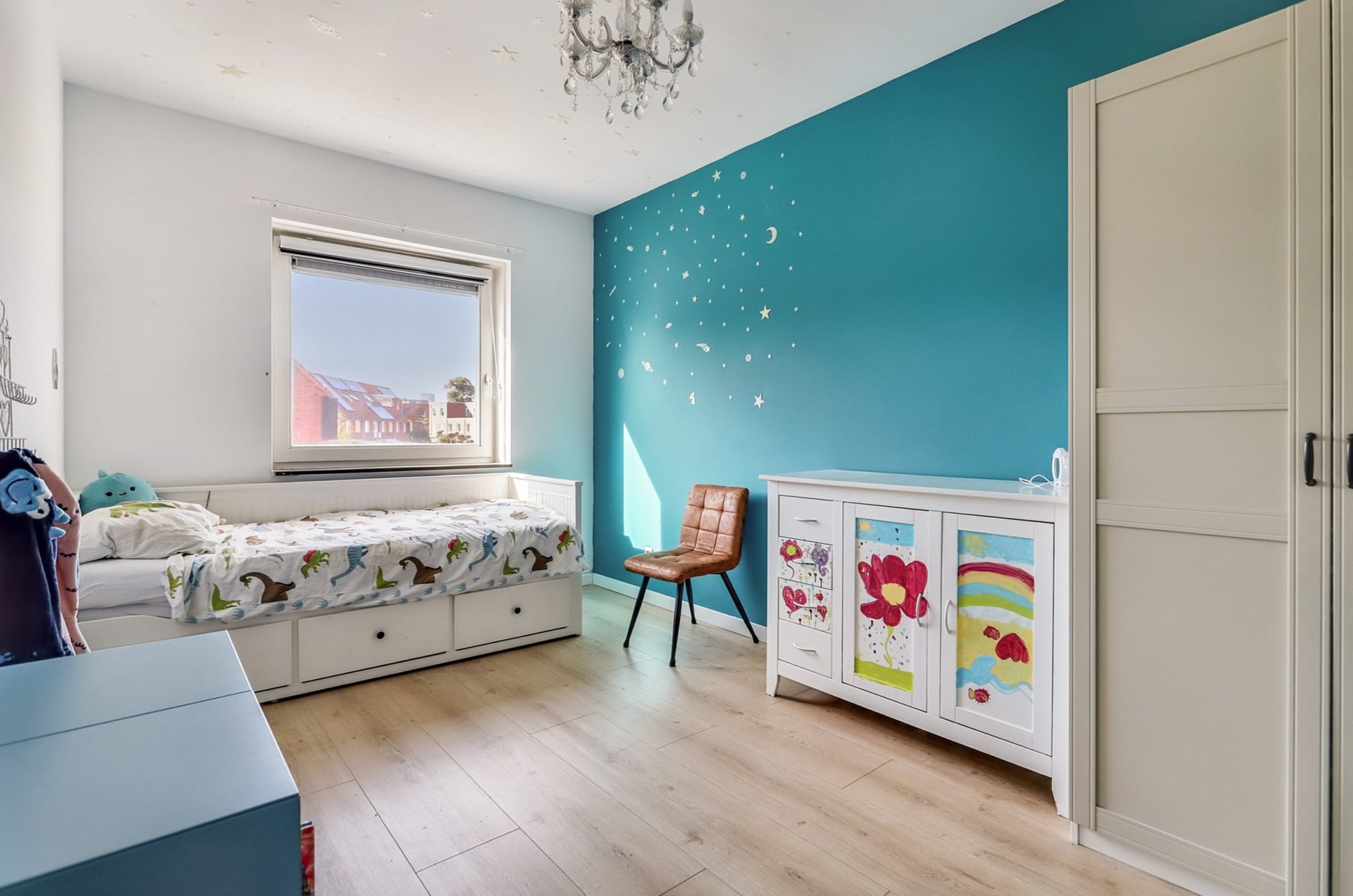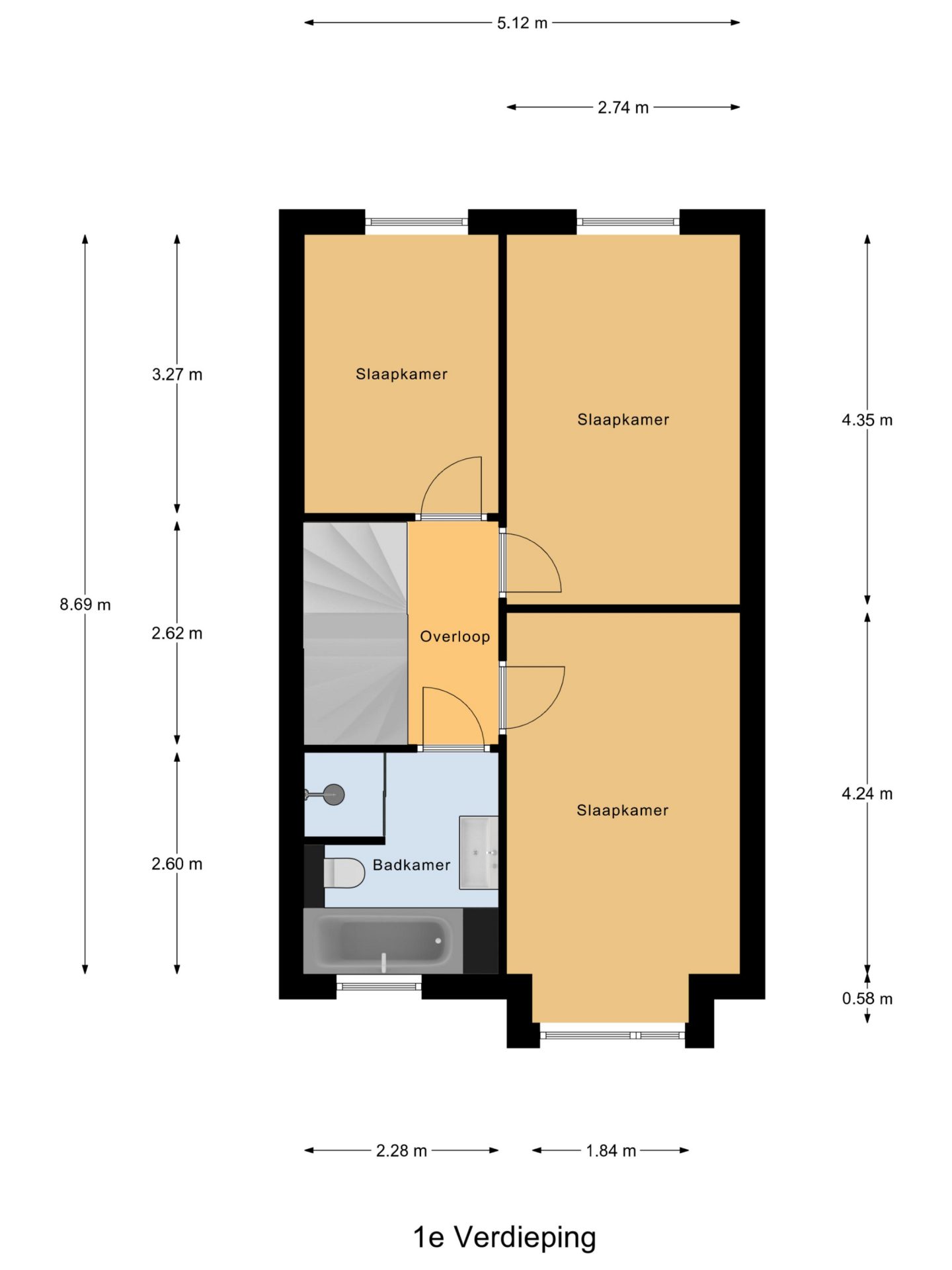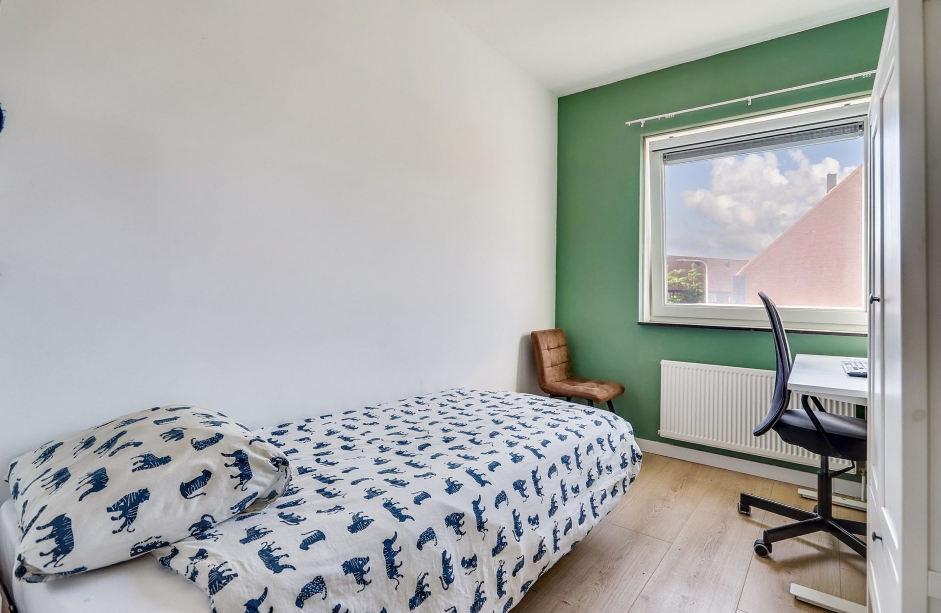 Op de eerste verdieping bevinden zich drie ruime slaapkamers, waarvan één aan de voorzijde en twee aan de achterzijde van de woning. Alle kamers zijn afgewerkt met een hoogwaardige laminaatvloer en strak gestucte wanden, wat zorgt voor een moderne en verzorgde uitstraling.