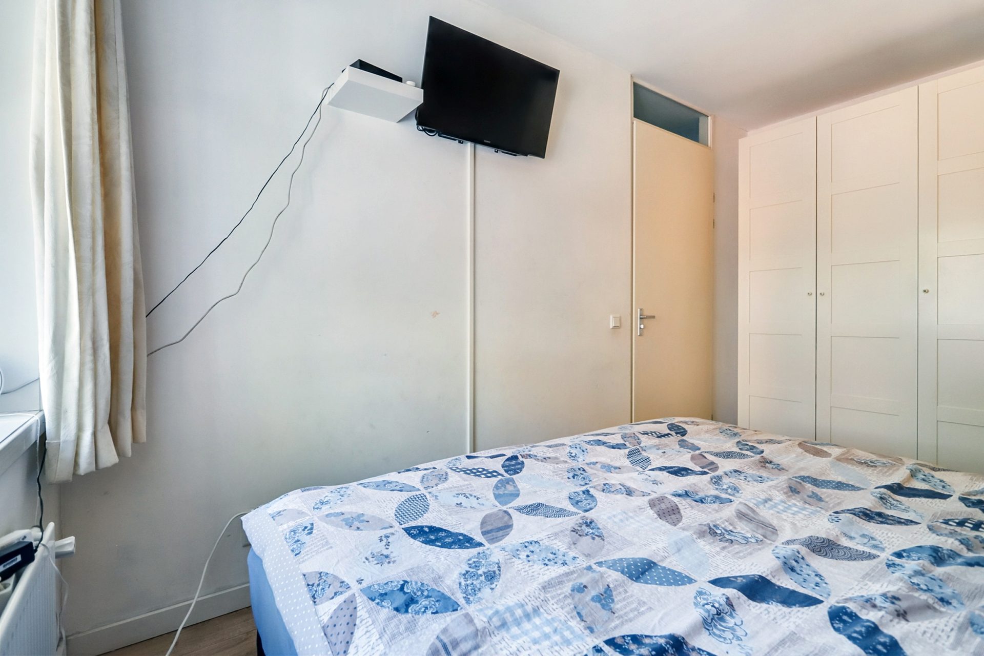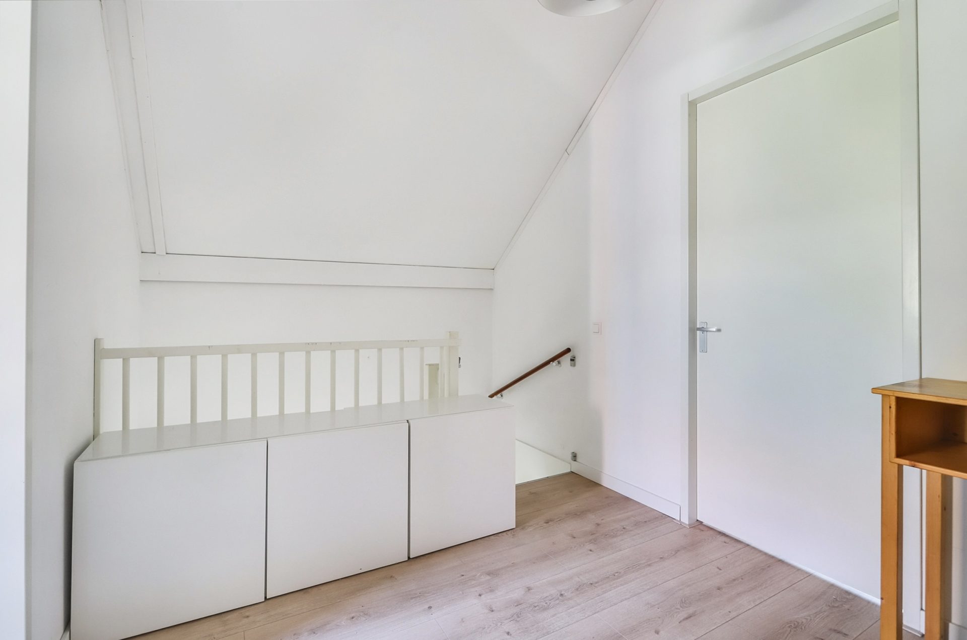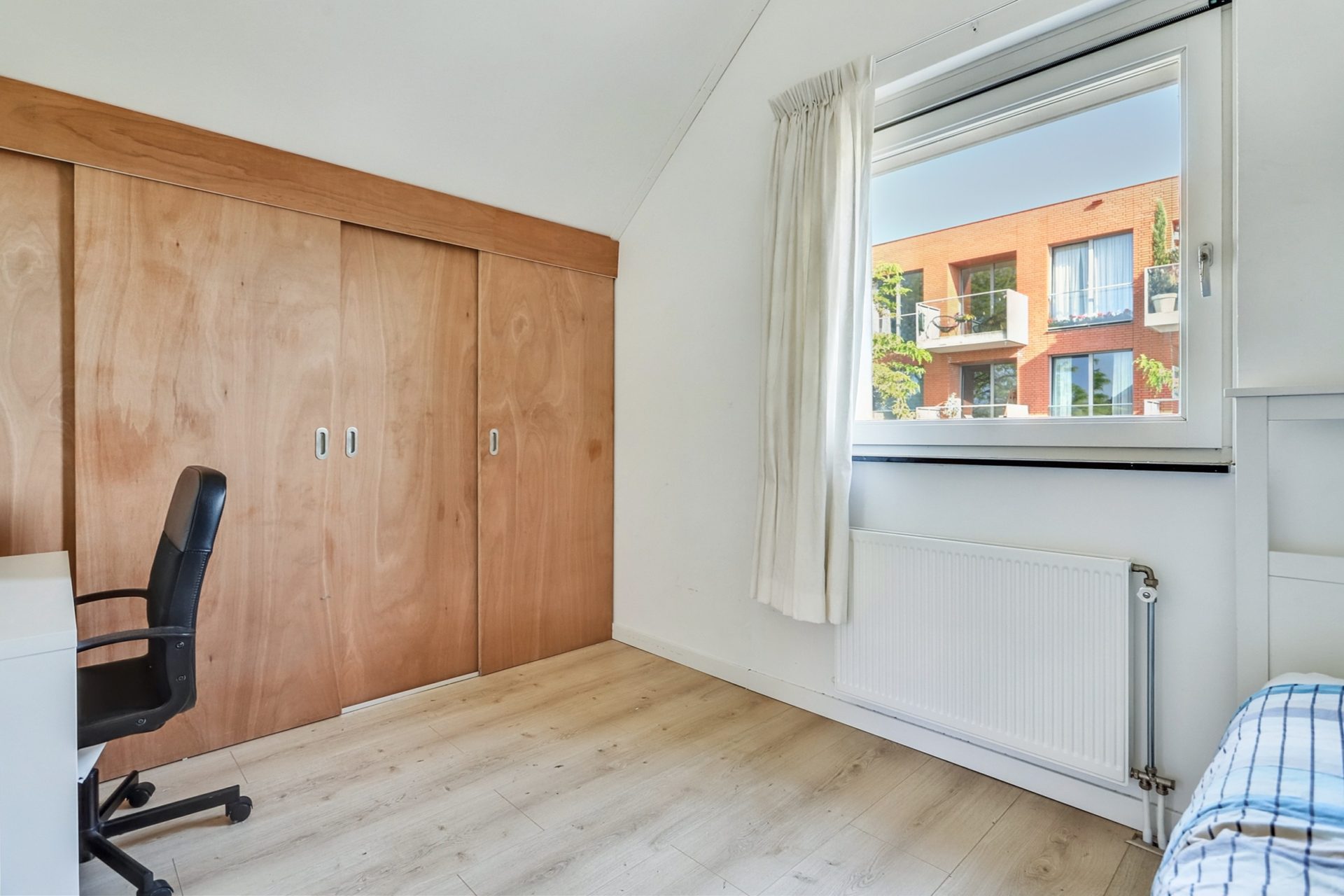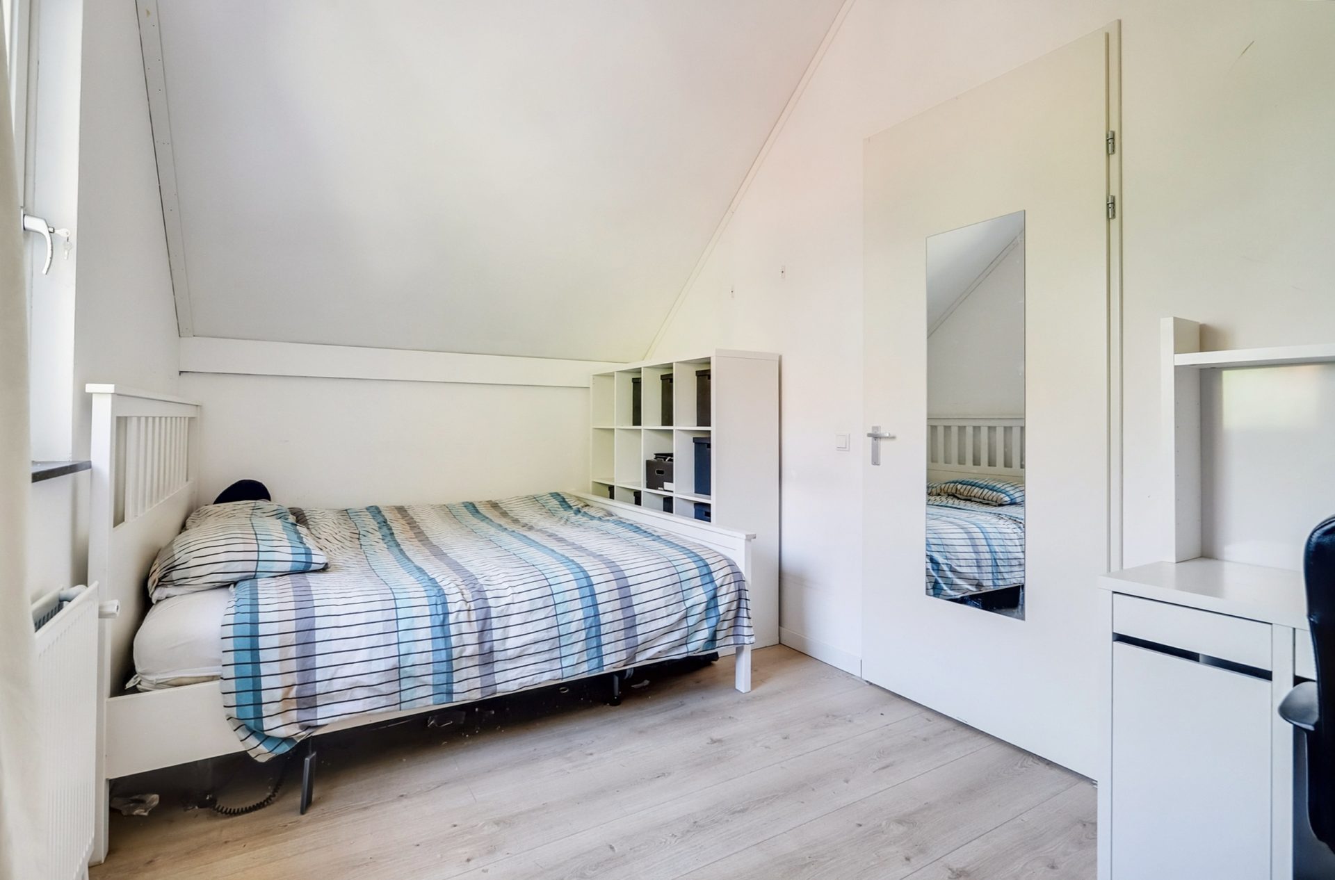 Via een vaste trap bereik je de ruime tweede verdieping met twee slaapkamers, één aan de voorzijde en één aan de achterzijde. De slaapkamer aan de voorzijde beschikt over een handige ingebouwde schuifwandkast, ideaal voor extra opbergruimte. Vanuit de overloop is er toegang tot een netjes weggewerkte technische ruimte achter een schuifwand, waarin de combiketel, de mechanische ventilatie-unit en de aansluitingen voor wasmachine en droger zijn geplaatst.