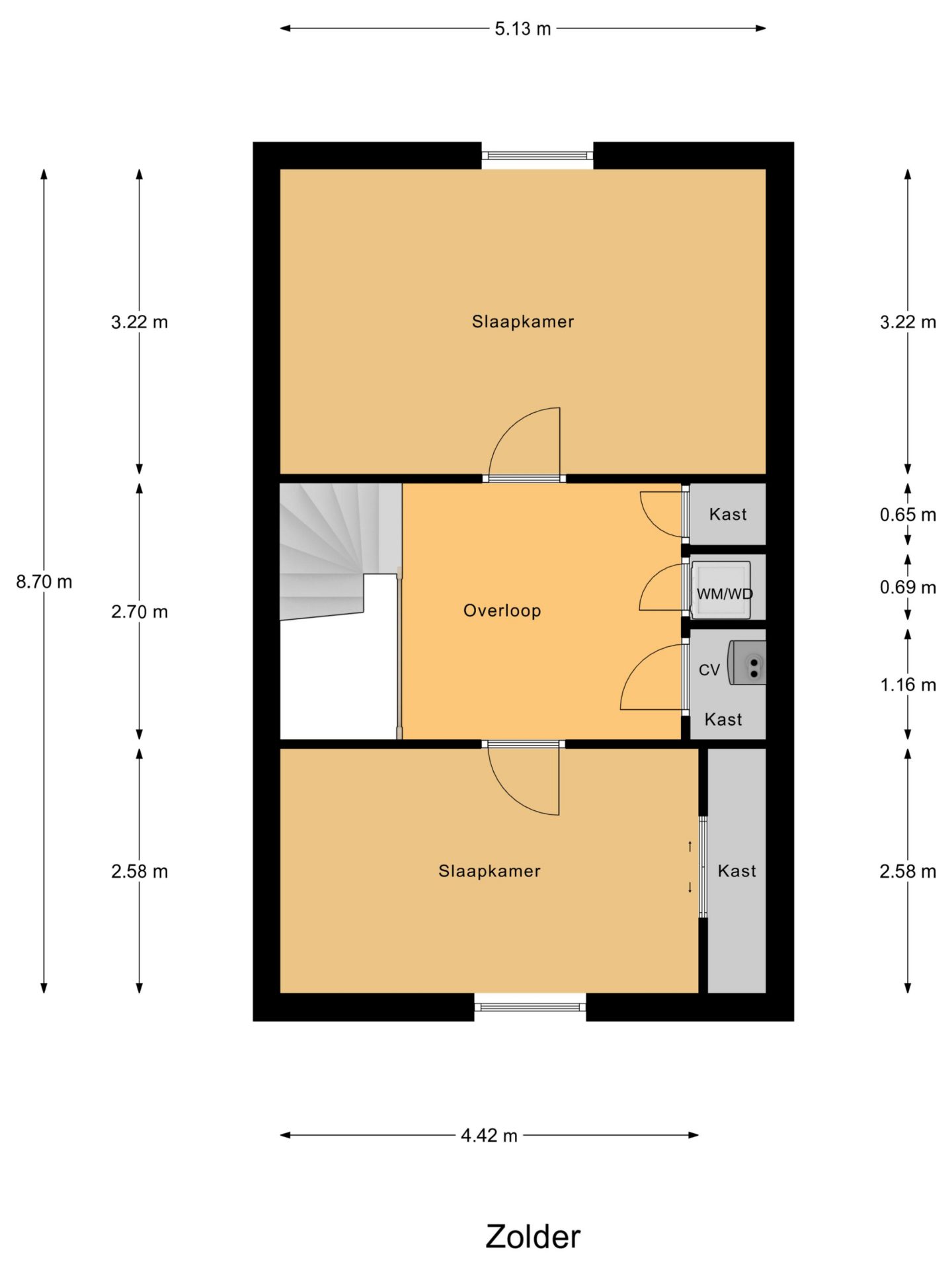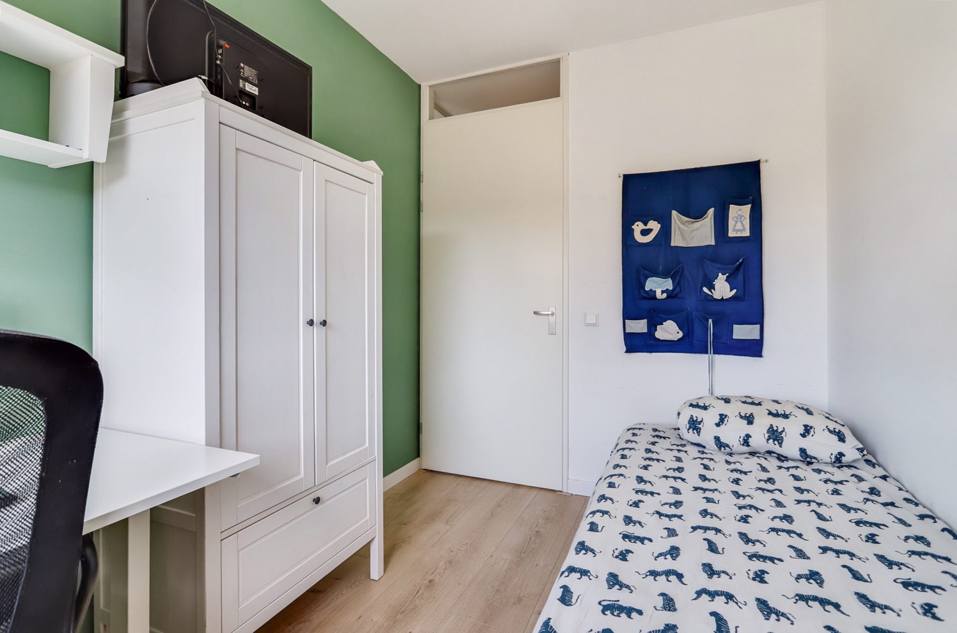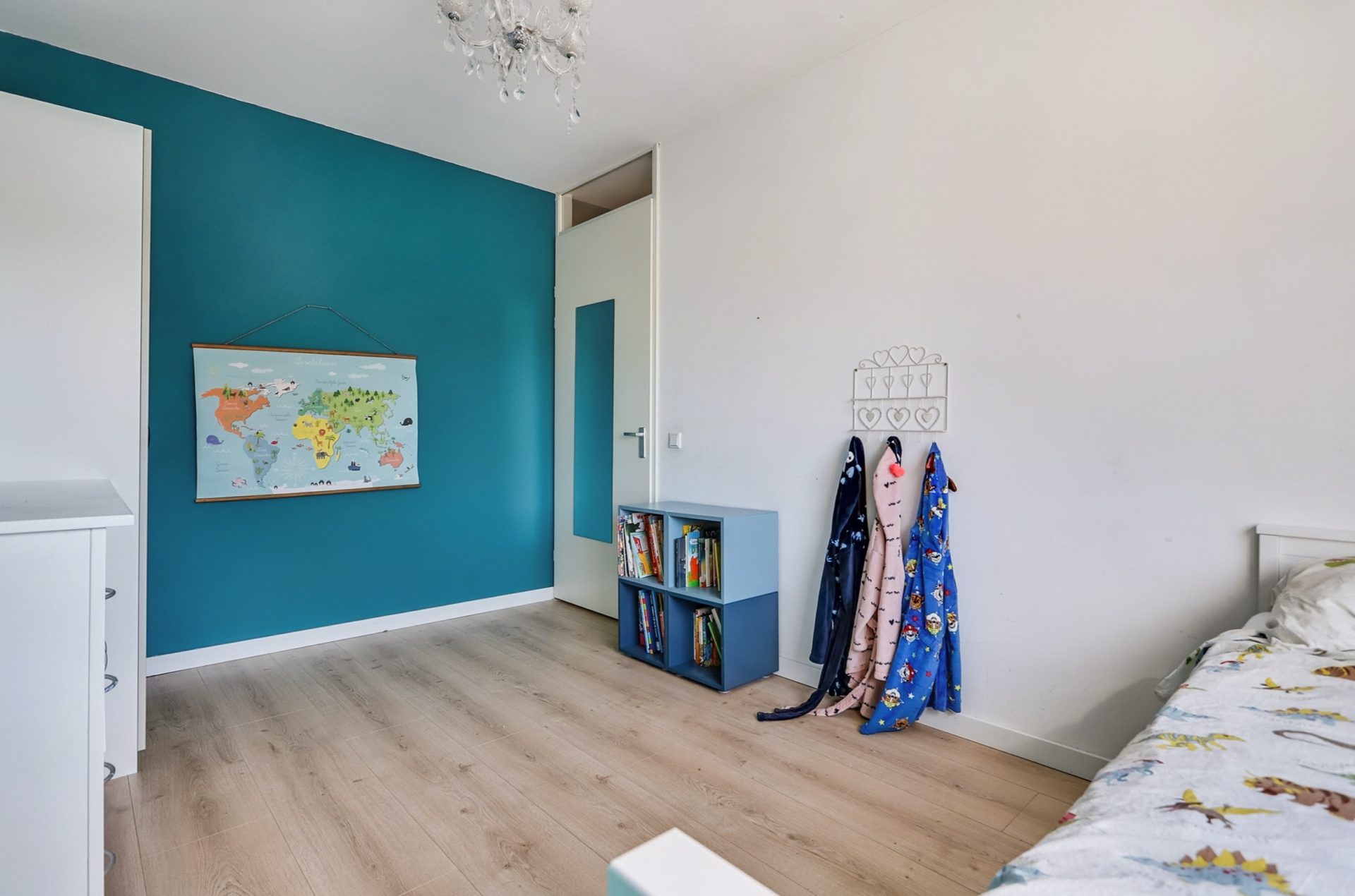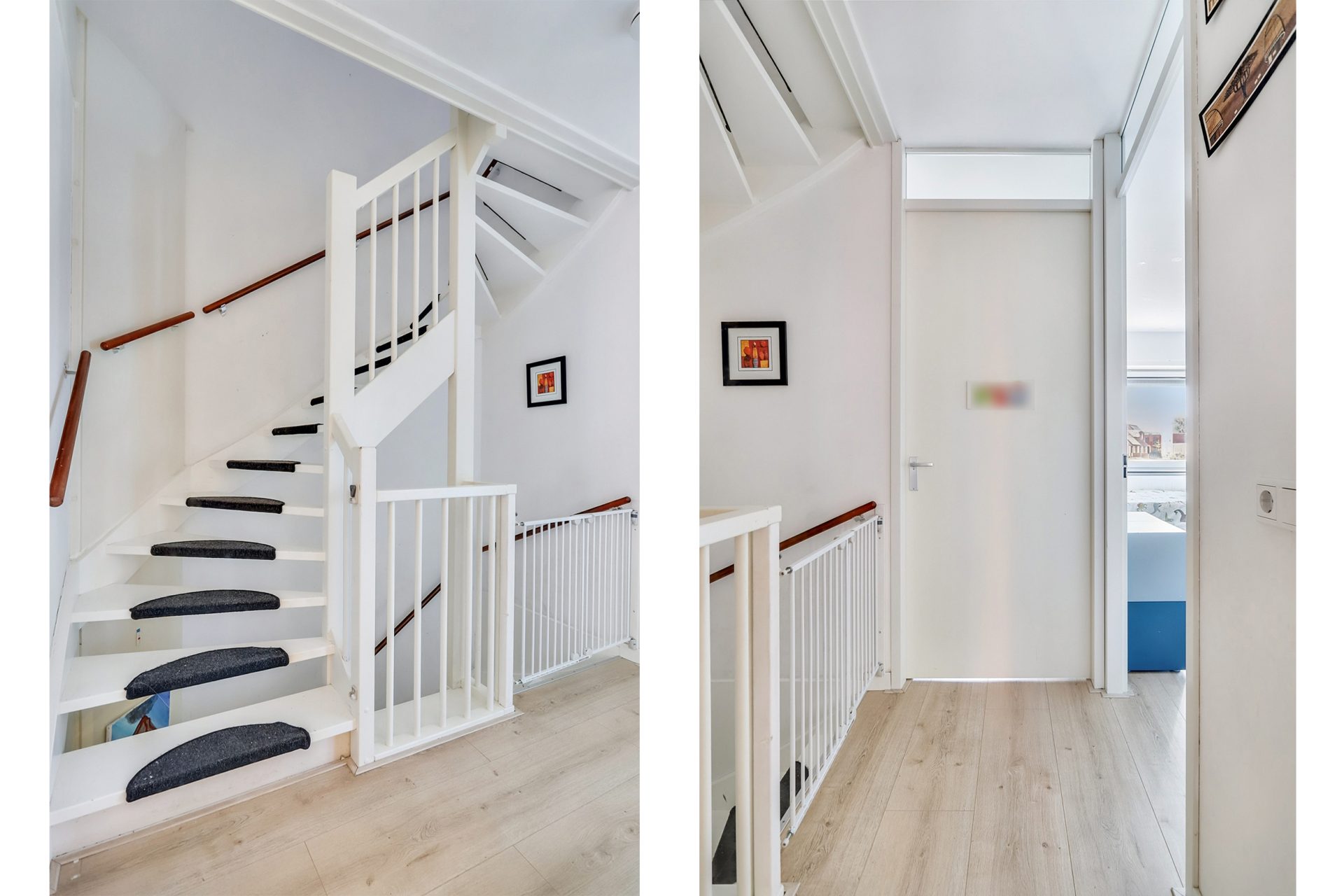 Via een vaste trap bereik je de ruime tweede verdieping met twee slaapkamers, één aan de voorzijde en één aan de achterzijde. De slaapkamer aan de voorzijde beschikt over een handige ingebouwde schuifwandkast, ideaal voor extra opbergruimte. Vanuit de overloop is er toegang tot een netjes weggewerkte technische ruimte achter een schuifwand, waarin de combiketel, de mechanische ventilatie-unit en de aansluitingen voor wasmachine en droger zijn geplaatst.