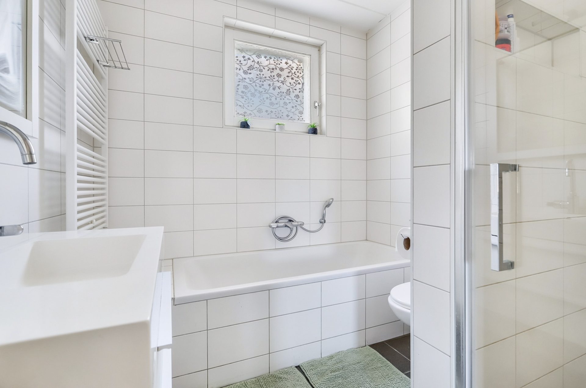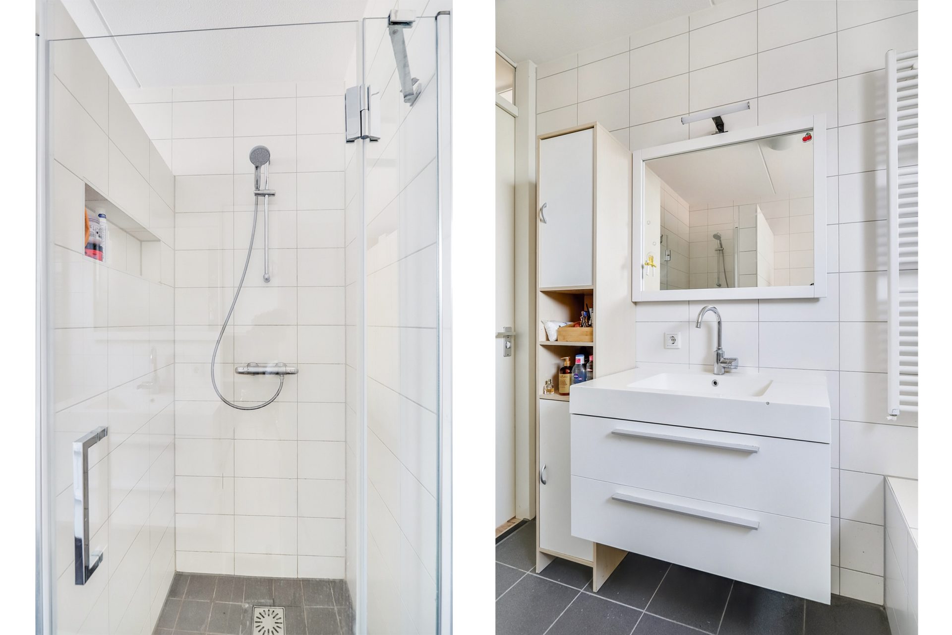 De badkamer is volledig betegeld, met witte wandtegels en donkere vloertegels, wat zorgt voor een moderne uitstraling. De ruimte is ingericht met een inloopdouche, een ligbad, een zwevend toilet, een wastafel met meubel en een designradiator.