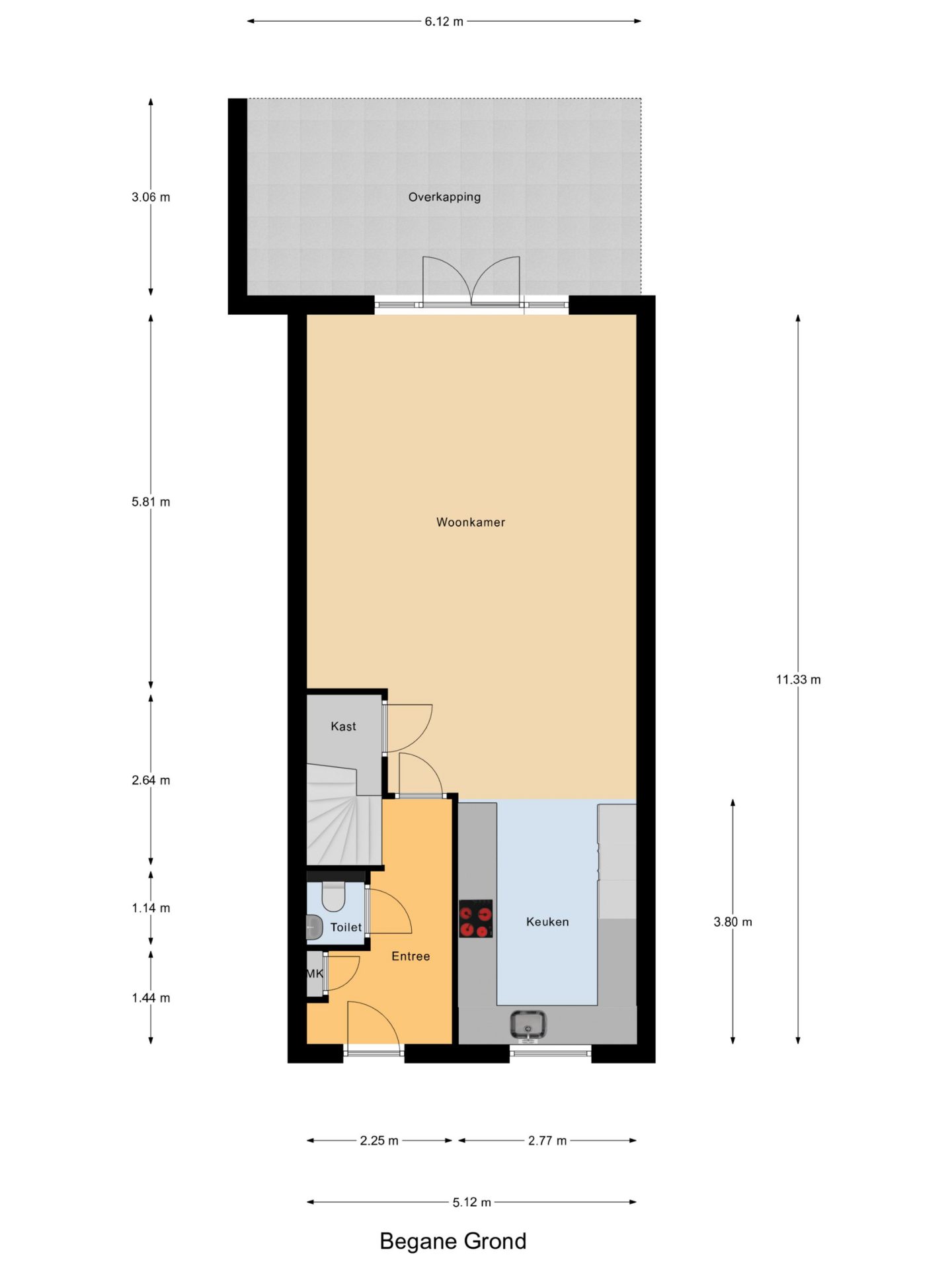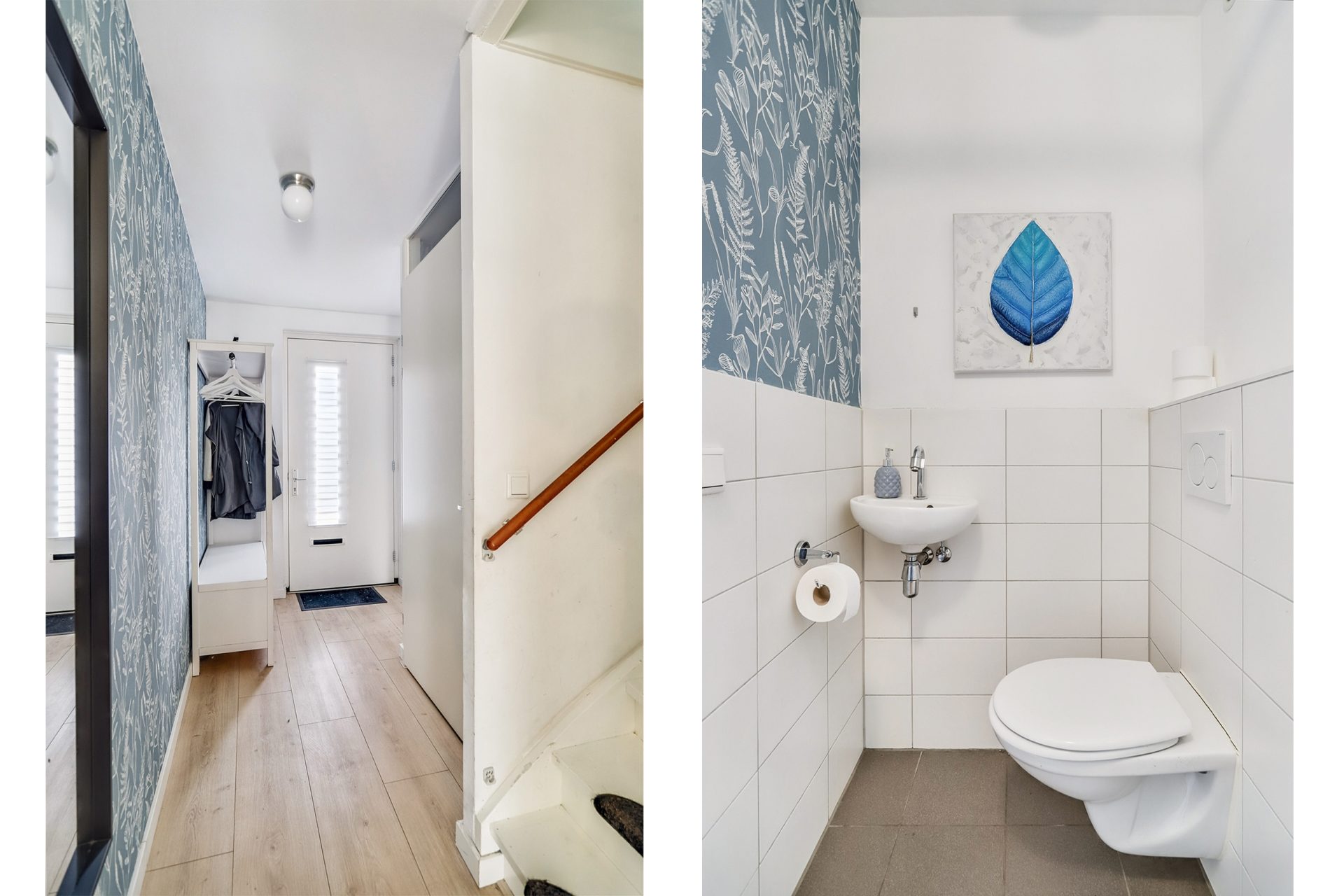 Bij binnenkomst stap je de hal binnen, met daarin de meterkast, garderobe en het toilet. Het toilet is gedeeltelijk betegeld en voorzien van een zwevend closet en fonteintje. Vanuit de hal heb je toegang tot de trapopgang en de woonkamer.