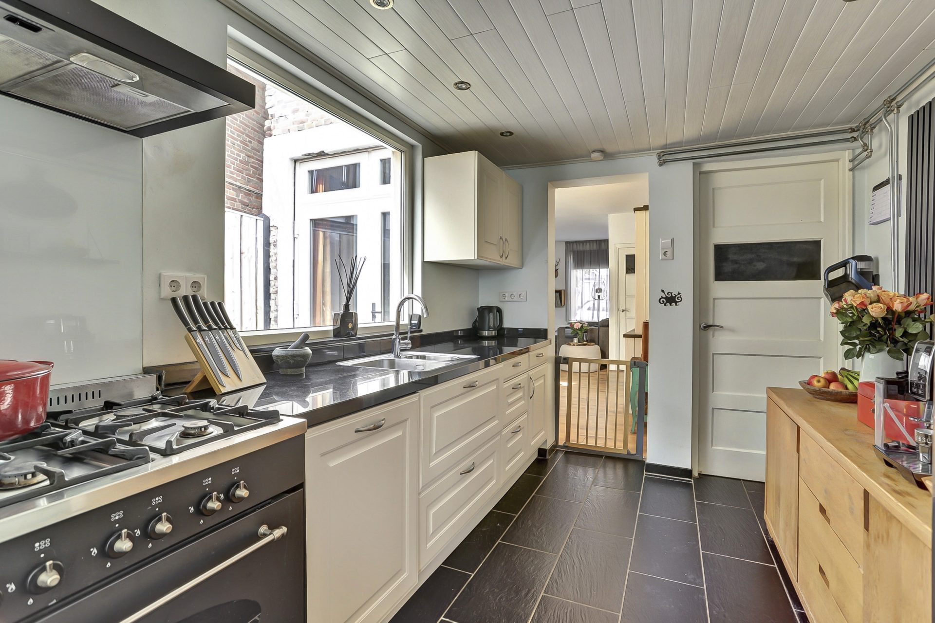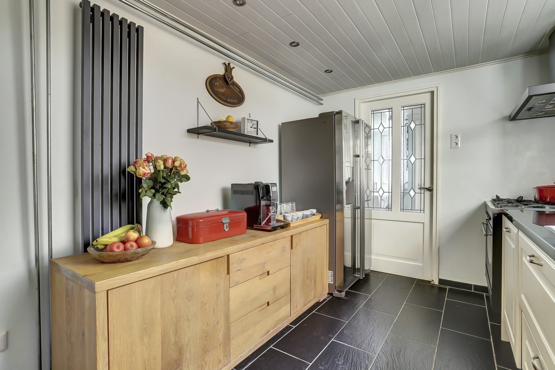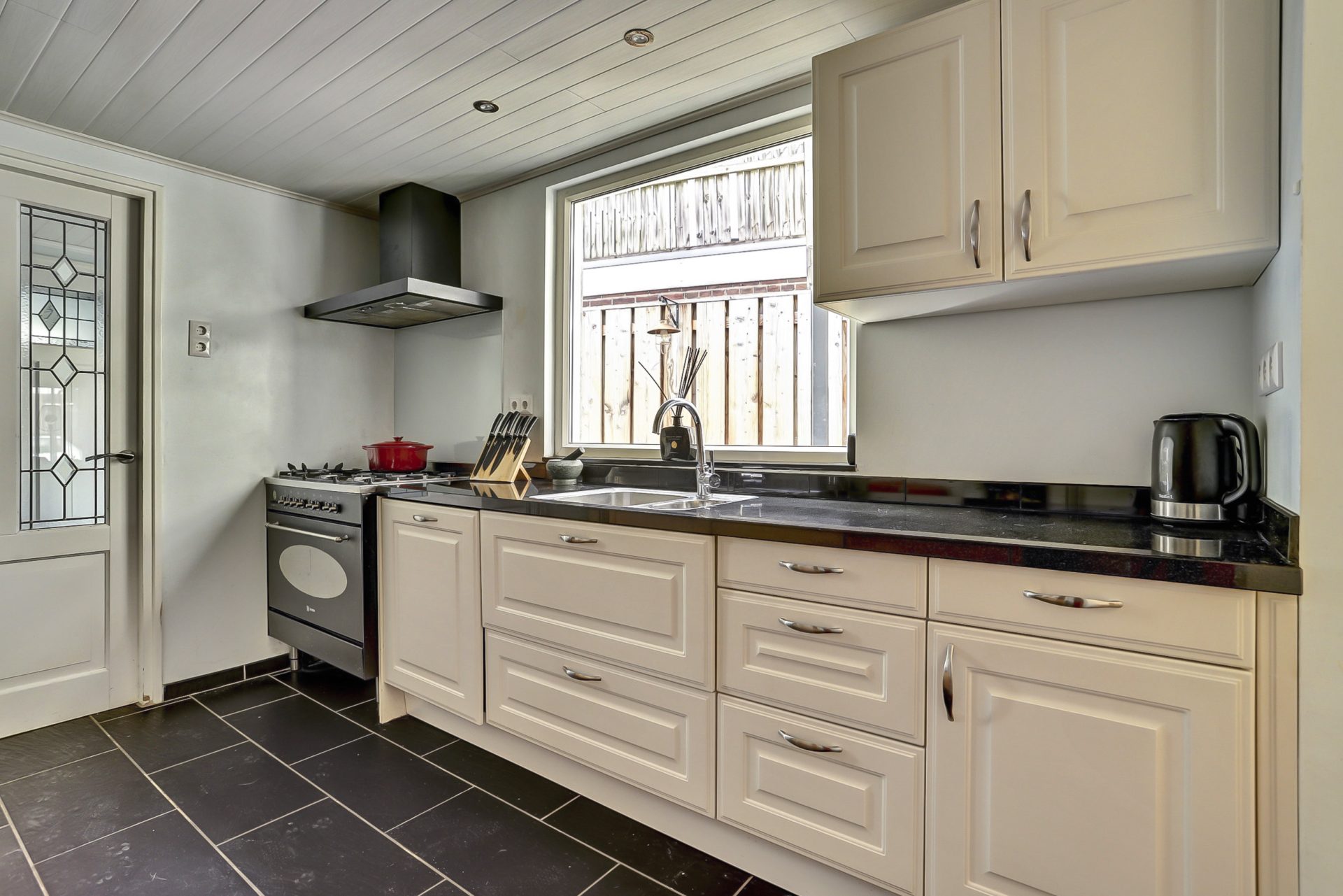 De keuken, gelegen in de uitbouw en bereikbaar vanuit de woonkamer, is compleet ingericht met een natuurstenen werkblad, vaatwasser, afzuigkap en een 6-pits fornuis met oven. De keuken biedt tevens toegang tot een royale trap-/kelderkast.