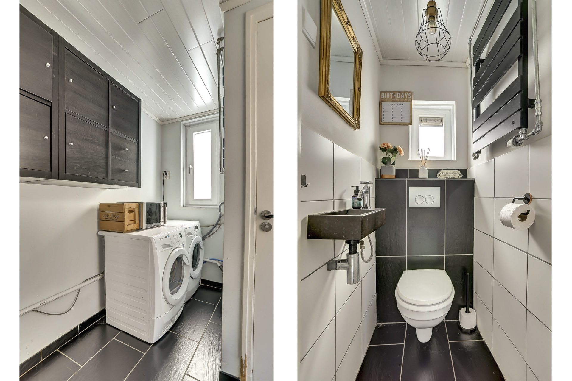 Grenzend aan de keuken bevindt zich de bijkeuken met opstelplaats voor wasmachine, droger en de CV-ketel. Vanuit deze ruimte is ook het moderne en stijlvolle toilet bereikbaar. De keuken en bijkeuken zijn beide afgewerkt met een tegelvloer.