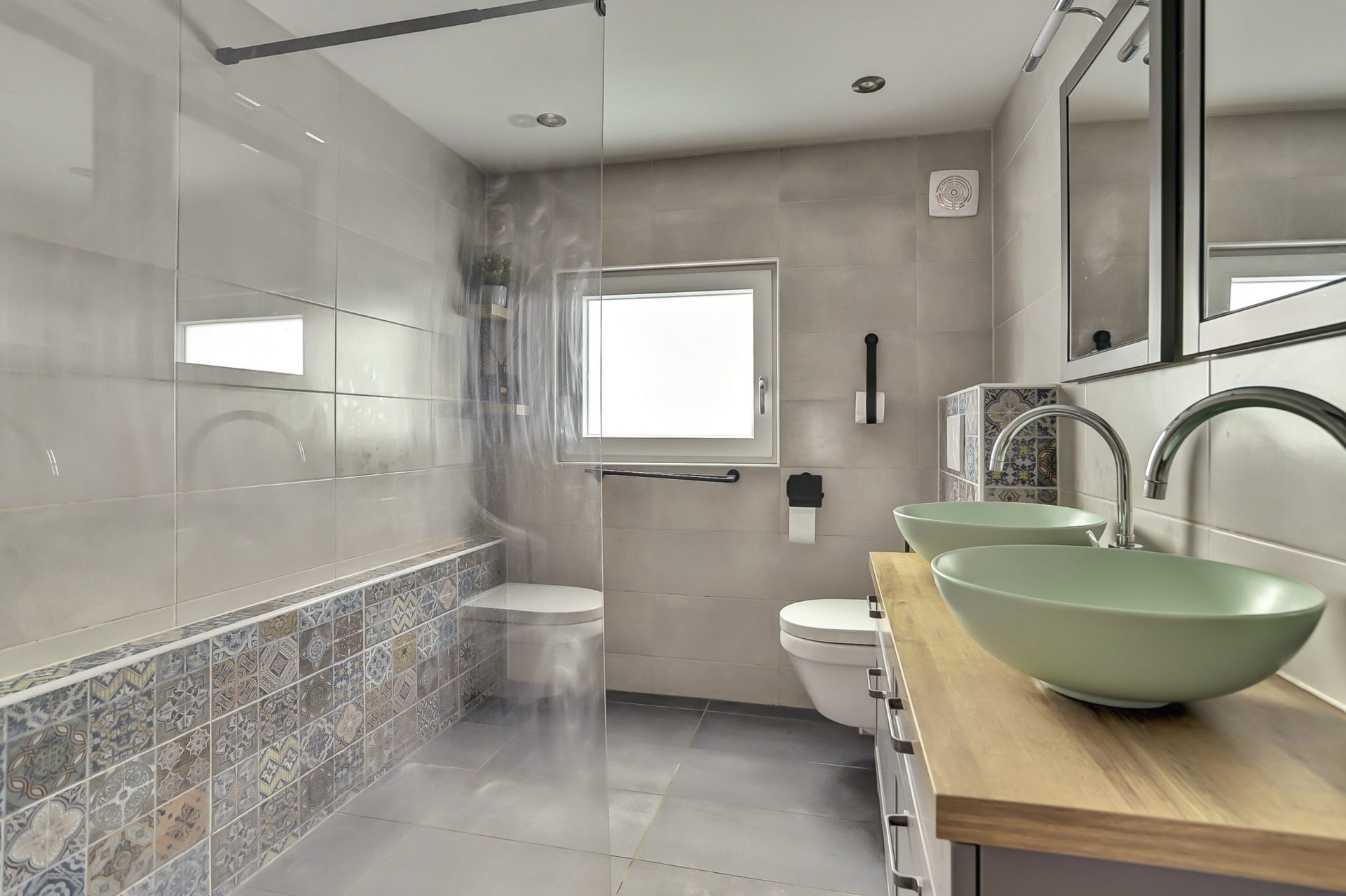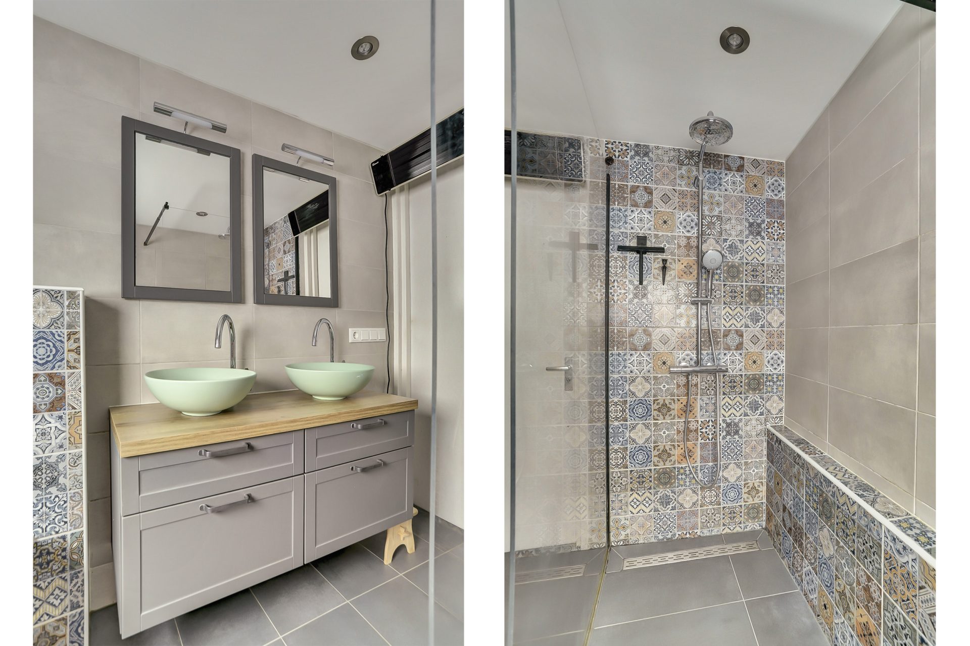 Tevens aan de achterzijde; de recent vernieuwde, geheel betegelde badkamer met inloopdouche, dubbele wastafel en toilet.
