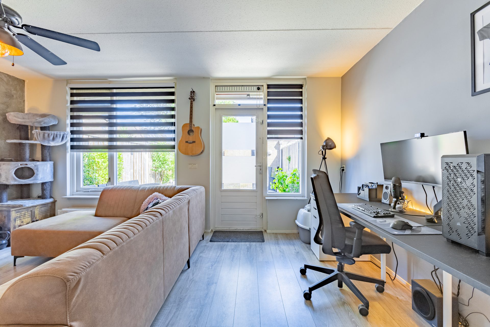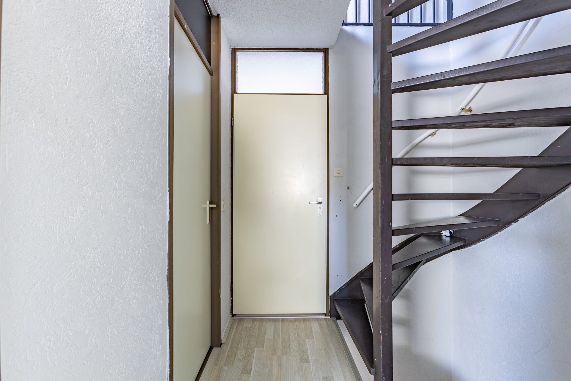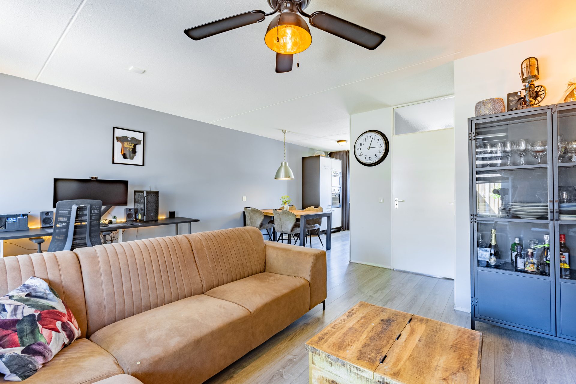 Je komt binnen in de hal met toegang het toilet en de lichte woonkamer. Dankzij de grote raampartijen aan de achterzijde geniet je hier van een prettige lichtinval gedurende de hele dag. De woonkamer is praktisch ingericht en biedt voldoende ruimte voor een gezellige zithoek én een eetgedeelte. Onder de trap bevindt zich een handige provisiekast – ideaal voor voorraad of schoonmaakspullen.