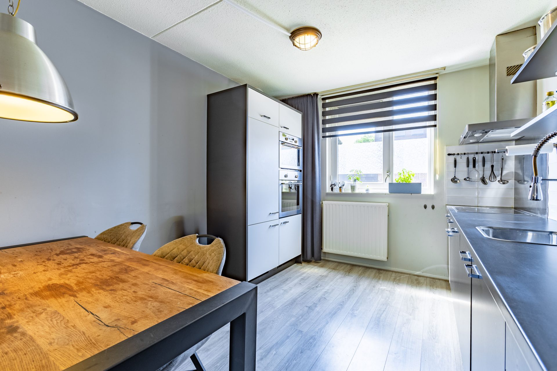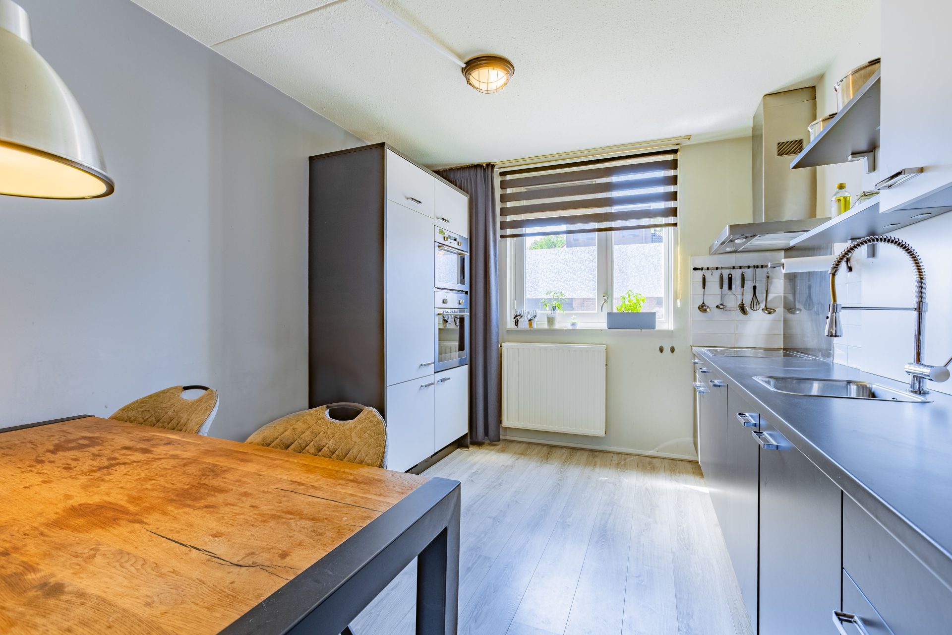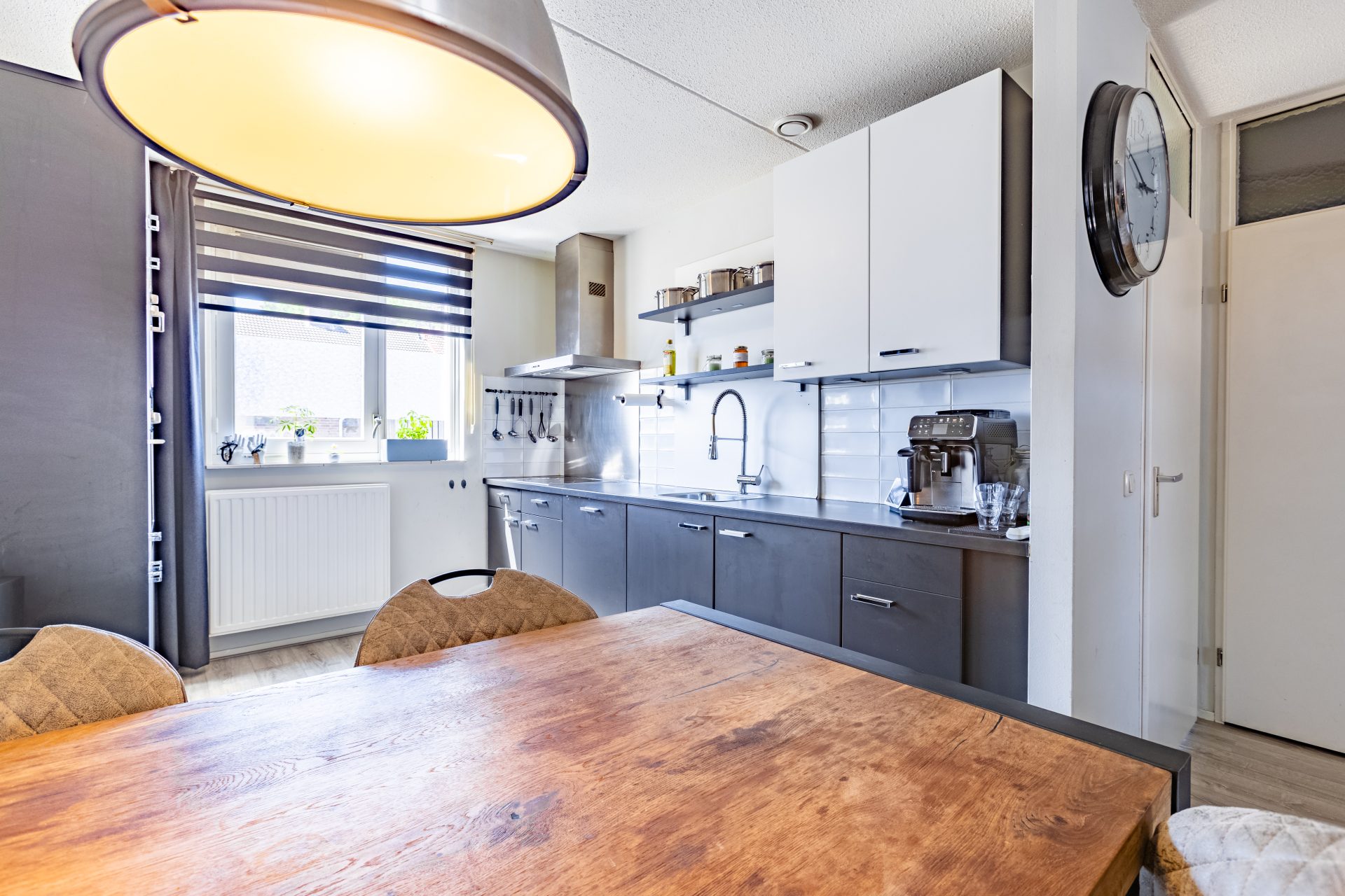 Je komt binnen in de hal met toegang het toilet en de lichte woonkamer. Dankzij de grote raampartijen aan de achterzijde geniet je hier van een prettige lichtinval gedurende de hele dag. De woonkamer is praktisch ingericht en biedt voldoende ruimte voor een gezellige zithoek én een eetgedeelte. Onder de trap bevindt zich een handige provisiekast – ideaal voor voorraad of schoonmaakspullen.