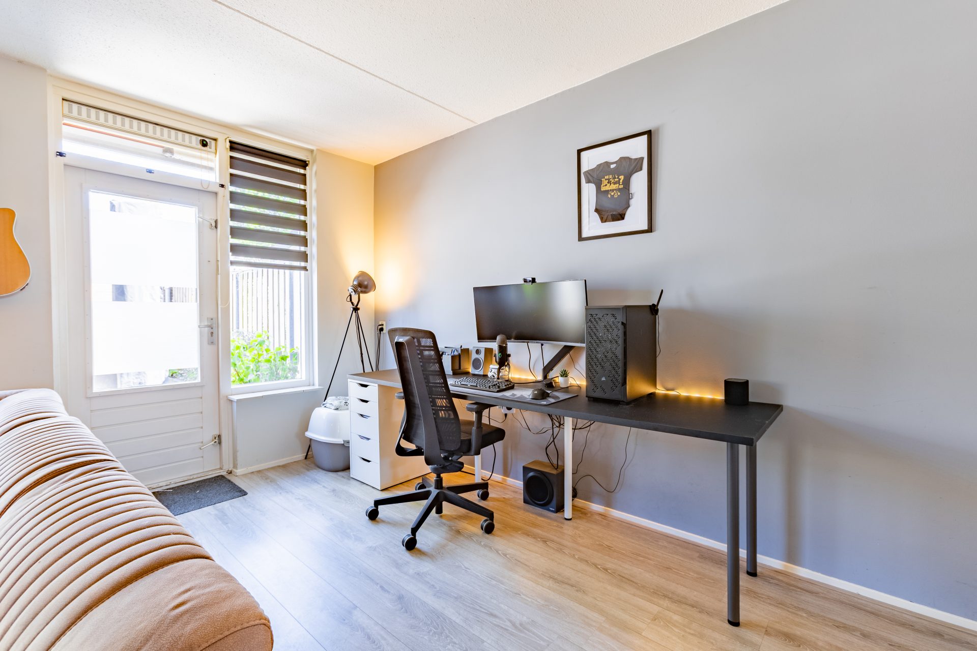Op de eerste verdieping bevinden zich twee slaapkamers, beide zijn netjes afgewerkt. De kamers zijn praktisch in te delen en geschikt als slaap-, werk- of logeerkamer. De badkamer is compleet en verzorgd ingericht met een inloopdouche, wastafel en een toilet – compact maar functioneel.