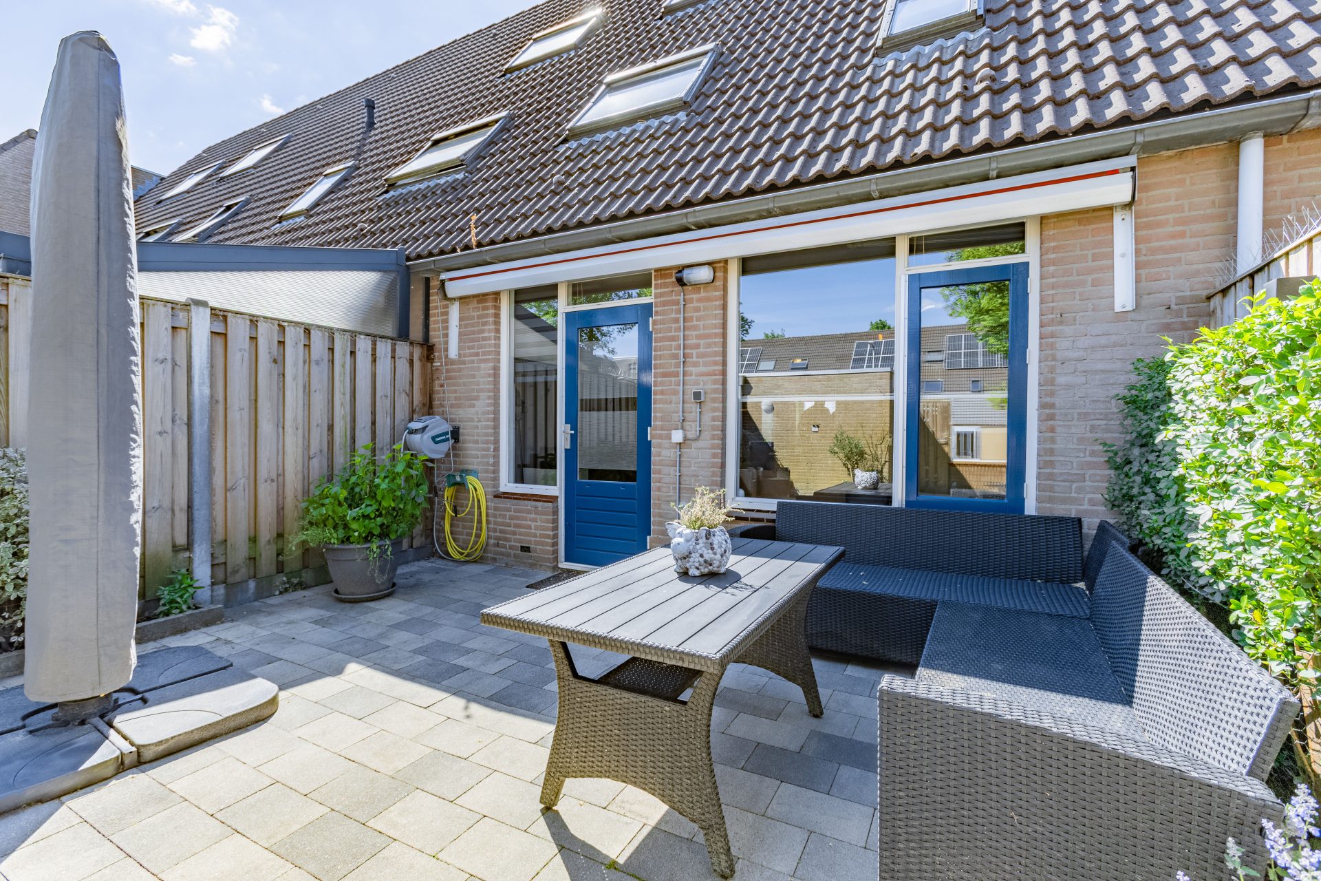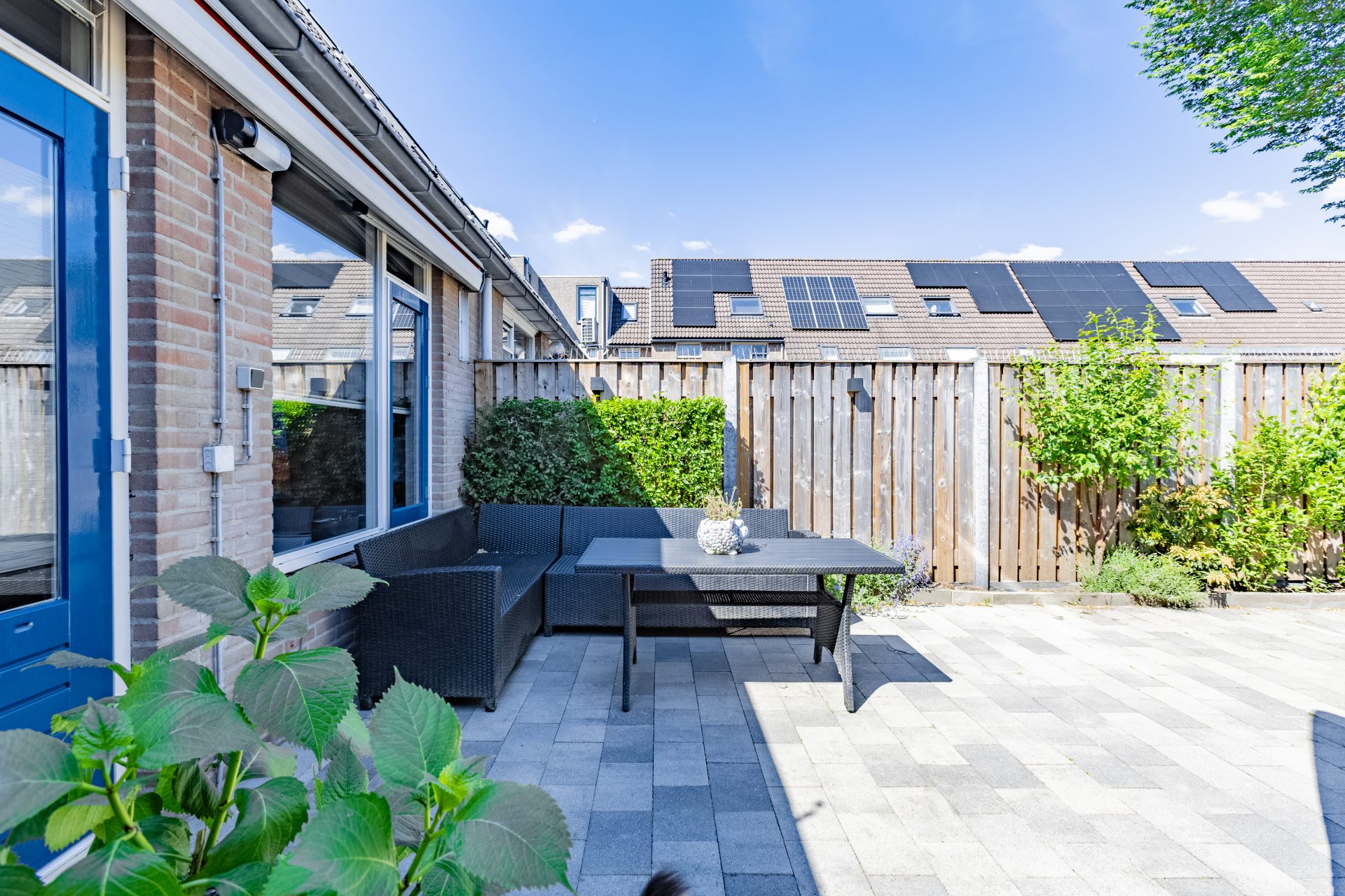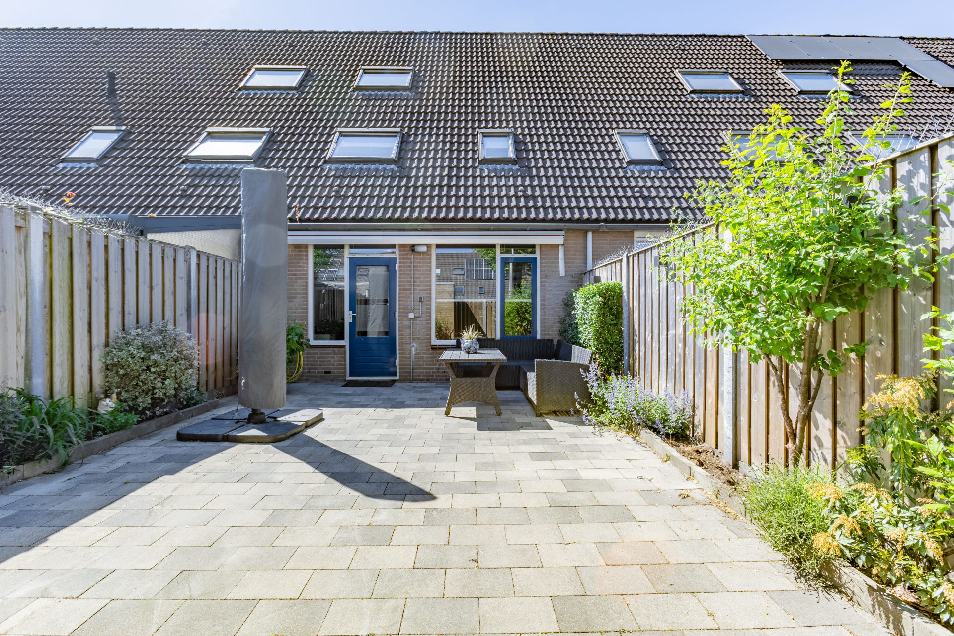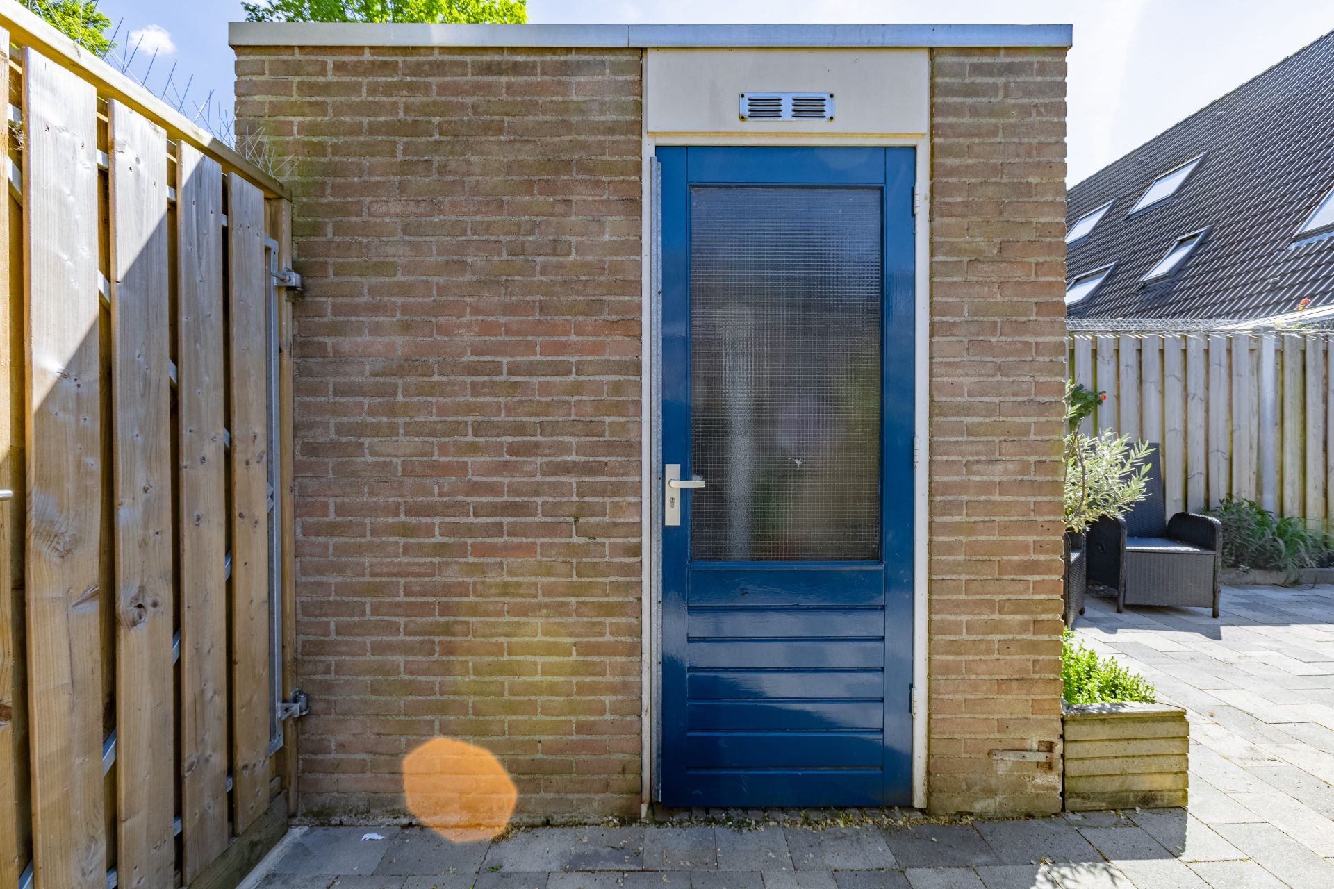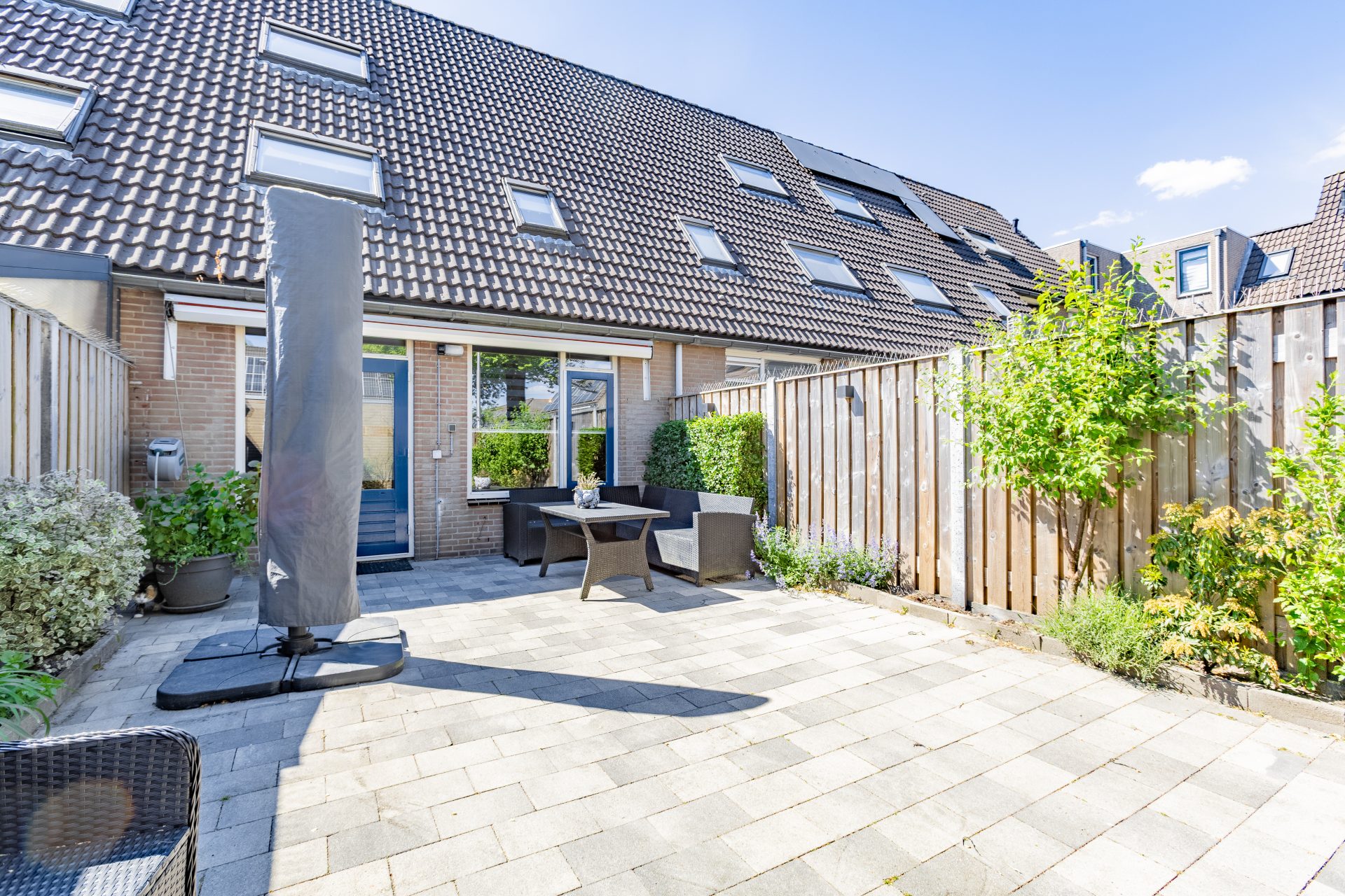 De onderhoudsvriendelijke achtertuin is maar liefst 10 meter diep en gunstig gelegen op het oosten. Je kunt hier heerlijk genieten van de ochtend- en vroege middagzon. De tuin is voorzien van sierbestrating, een achterom en een vrijstaande stenen berging – perfect voor het stallen van fietsen of het opbergen van tuingereedschap. Direct achter de woning ligt een ruim openbaar parkeerterrein waar je altijd een plek vindt voor je auto.