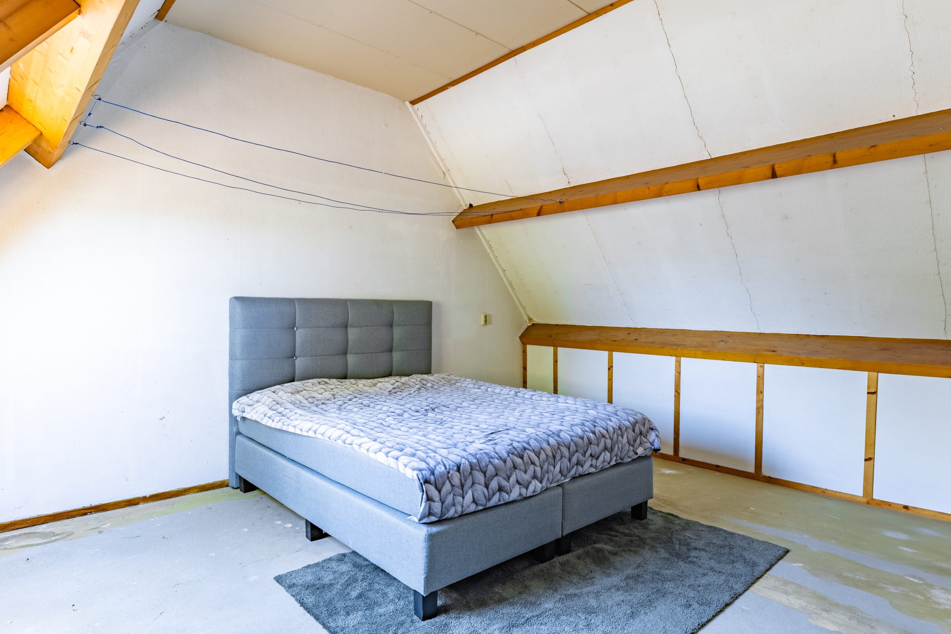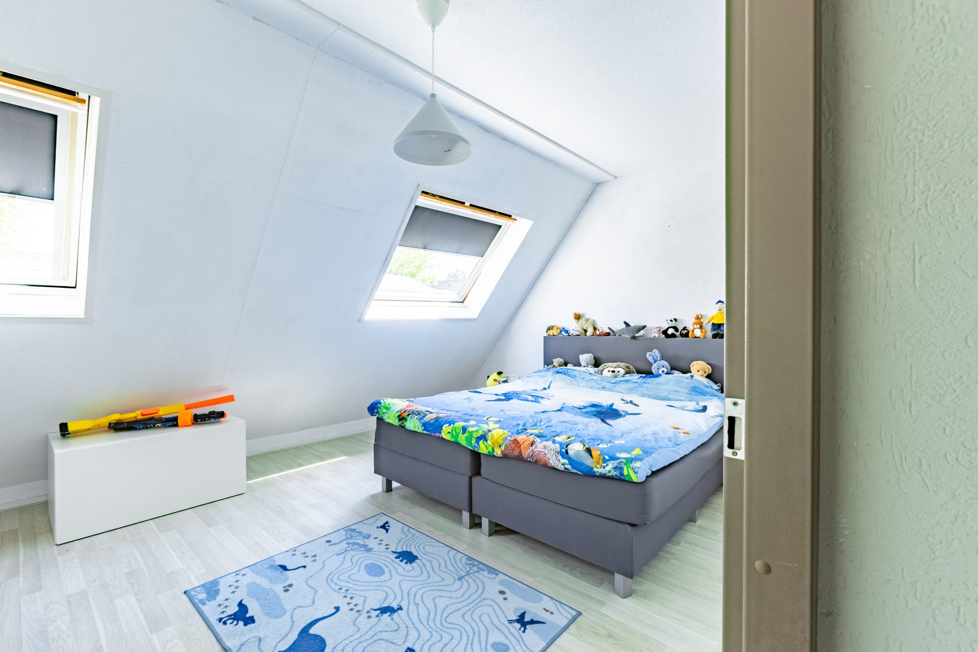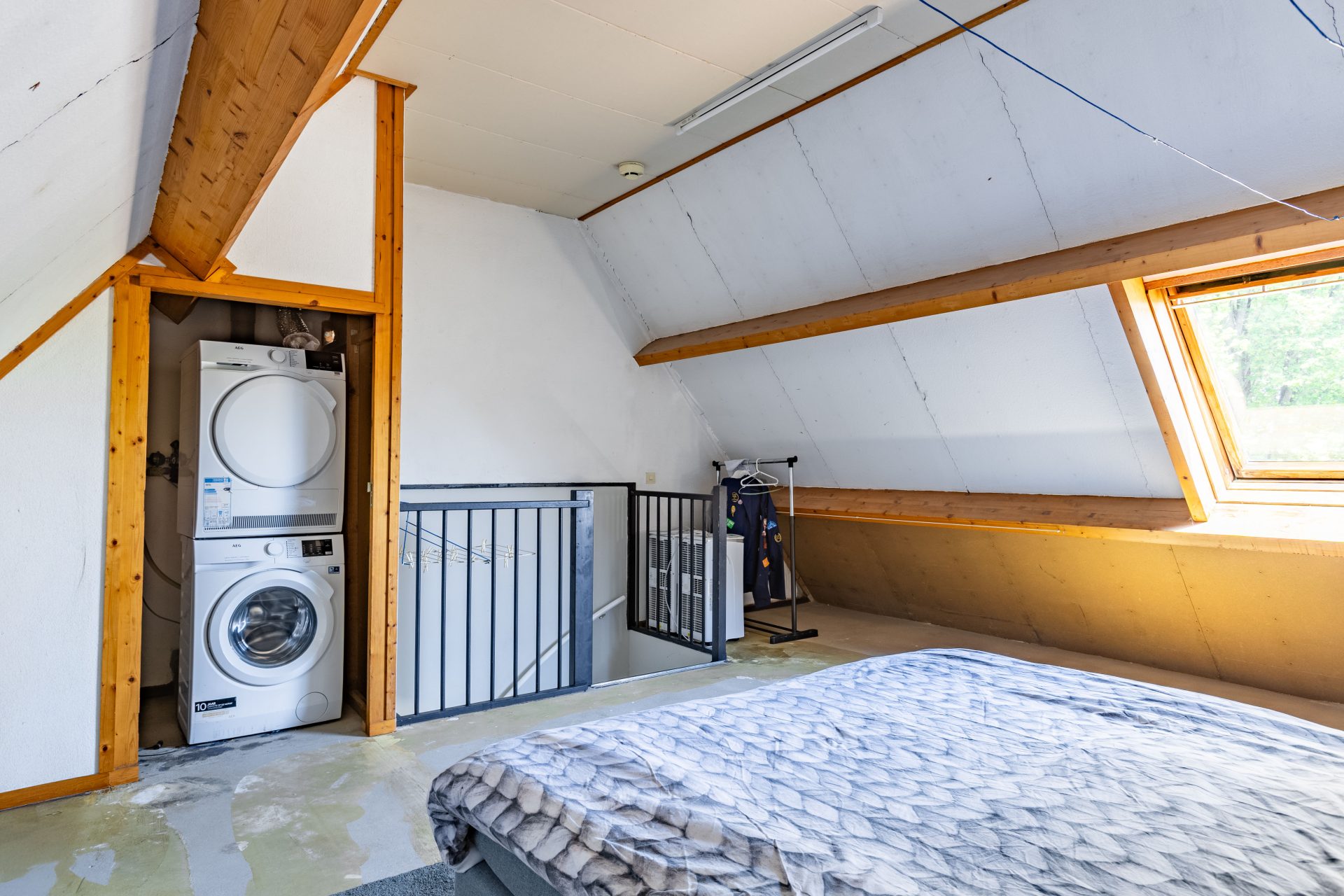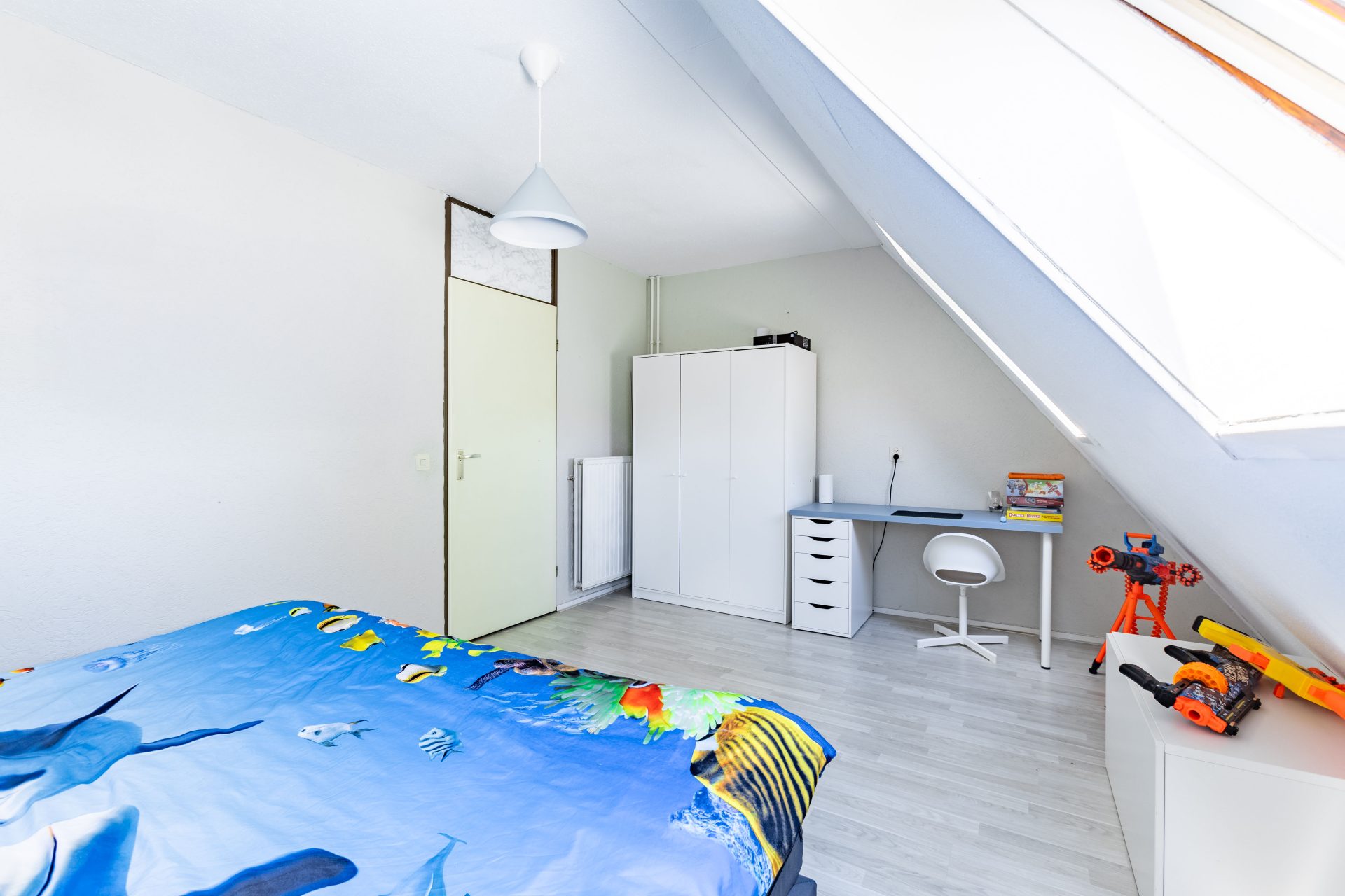 De verrassing van het huis vind je op zolder. Via een vaste trap bereik je een ruime derde slaapkamer met een groot Velux dakraam, waardoor ook deze verdieping volop daglicht biedt. De ruimte is zeer geschikt als hoofdslaapkamer, thuiskantoor of hobbyruimte, en beschikt bovendien over voldoende bergruimte en aansluitingen voor wasapparatuur.