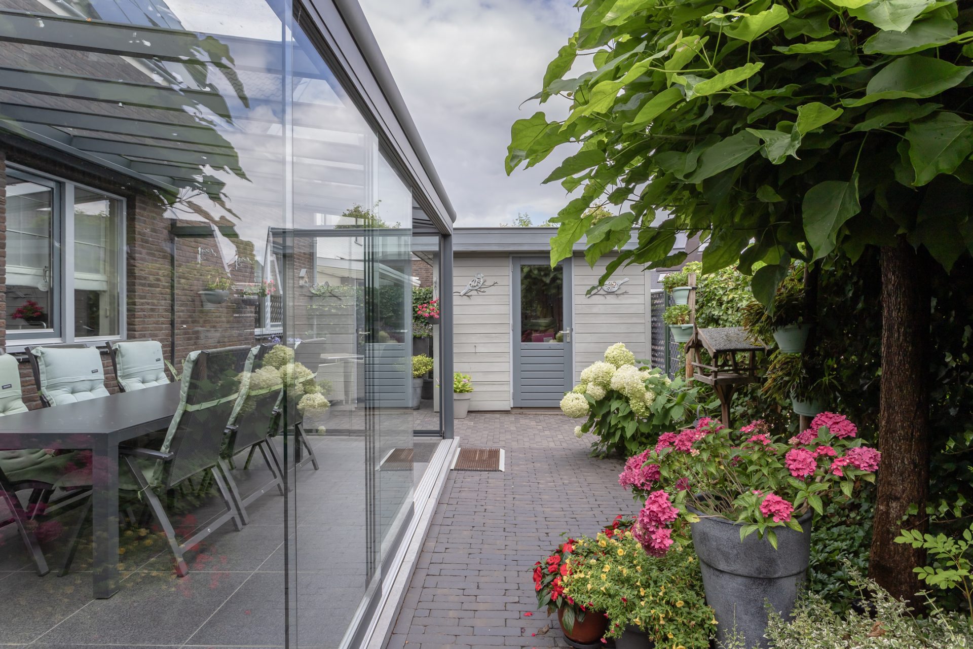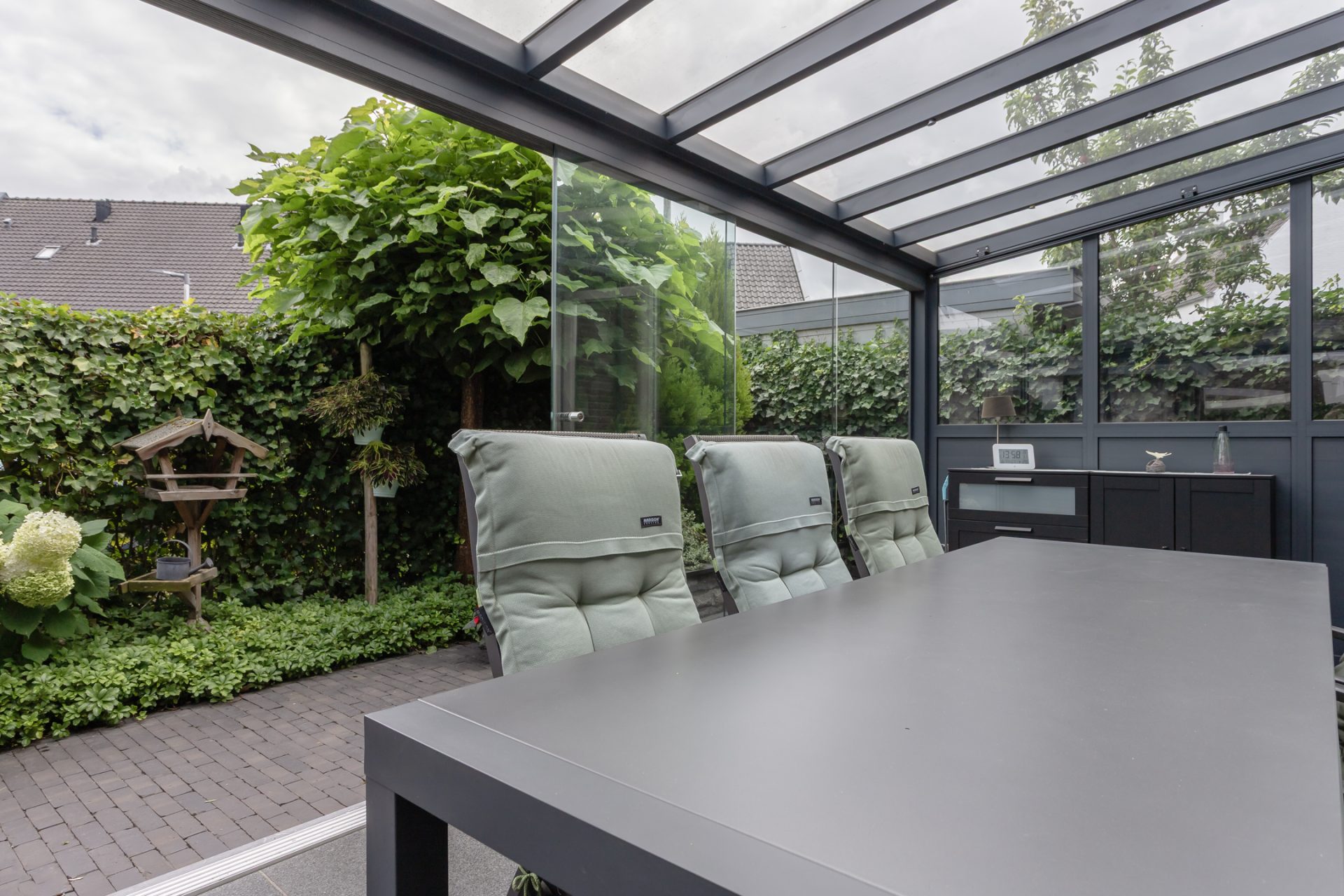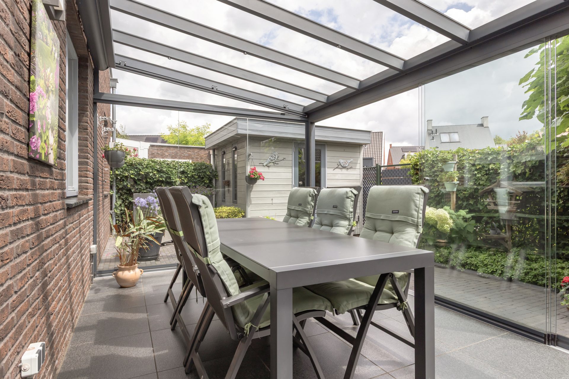 Vanuit de woonkamer bereik je via de tuindeuren de terrasoverkapping.