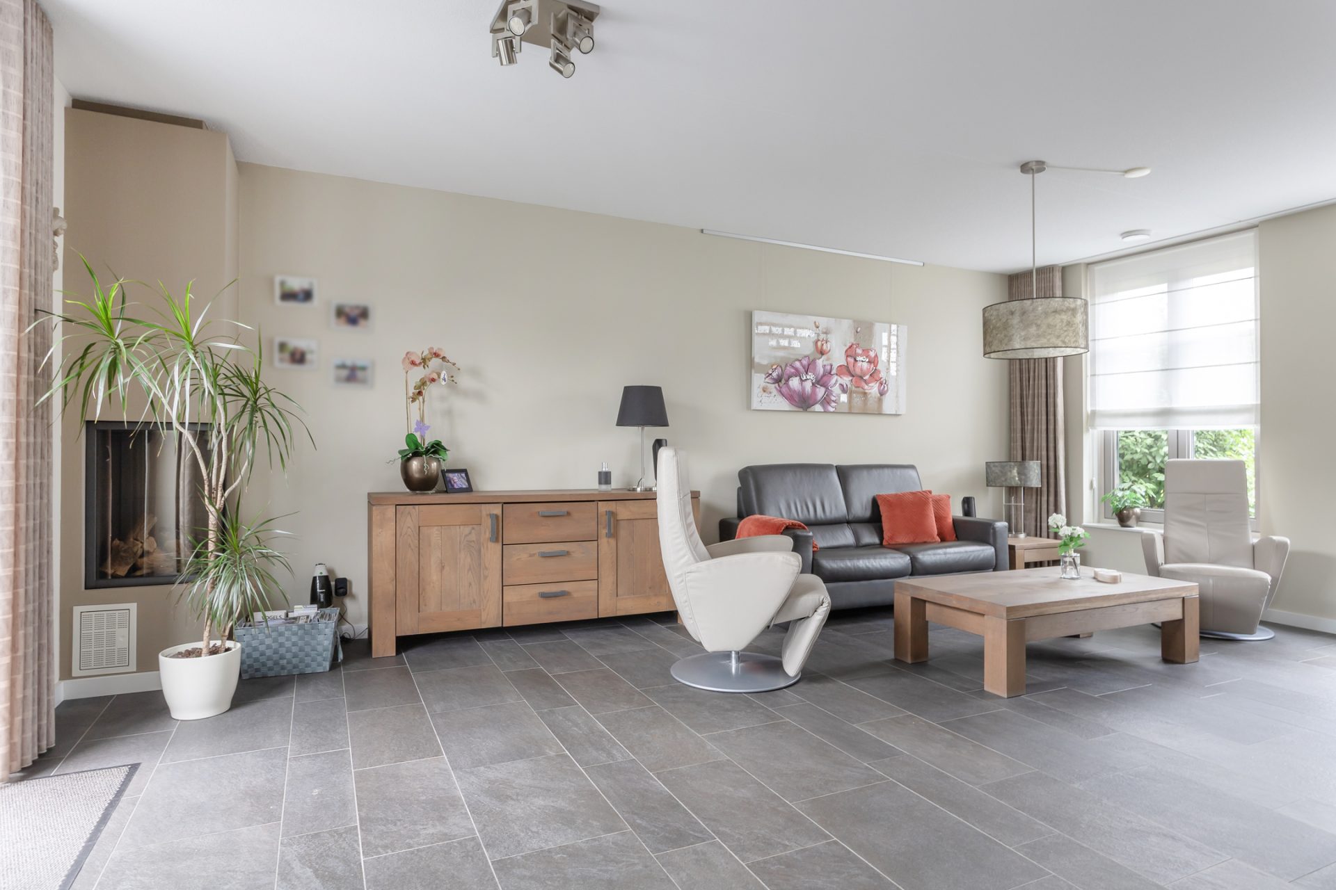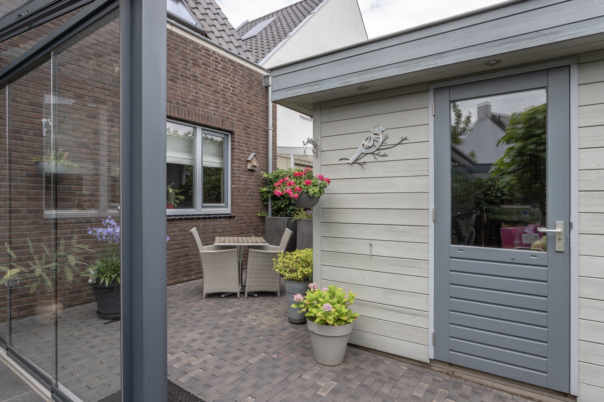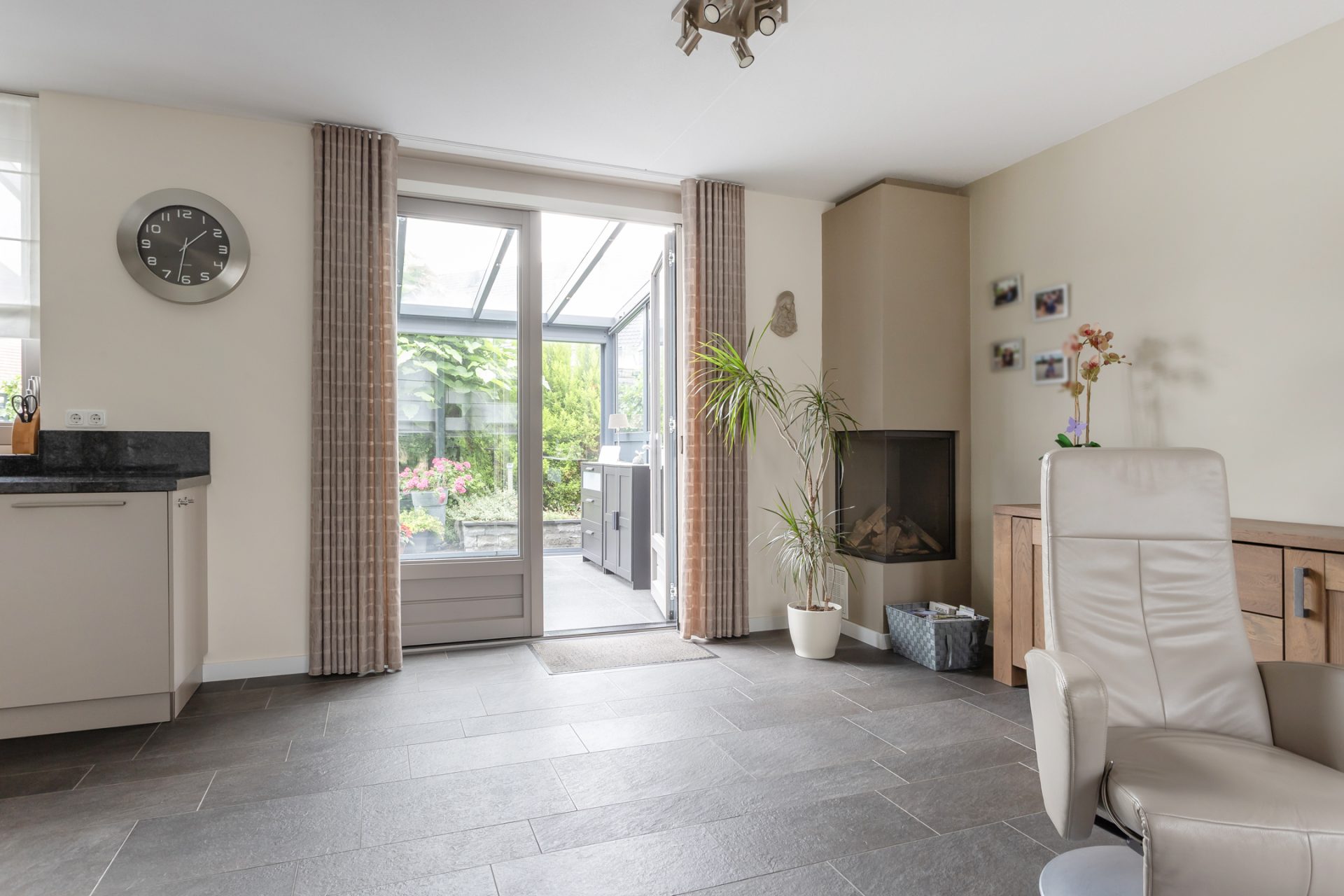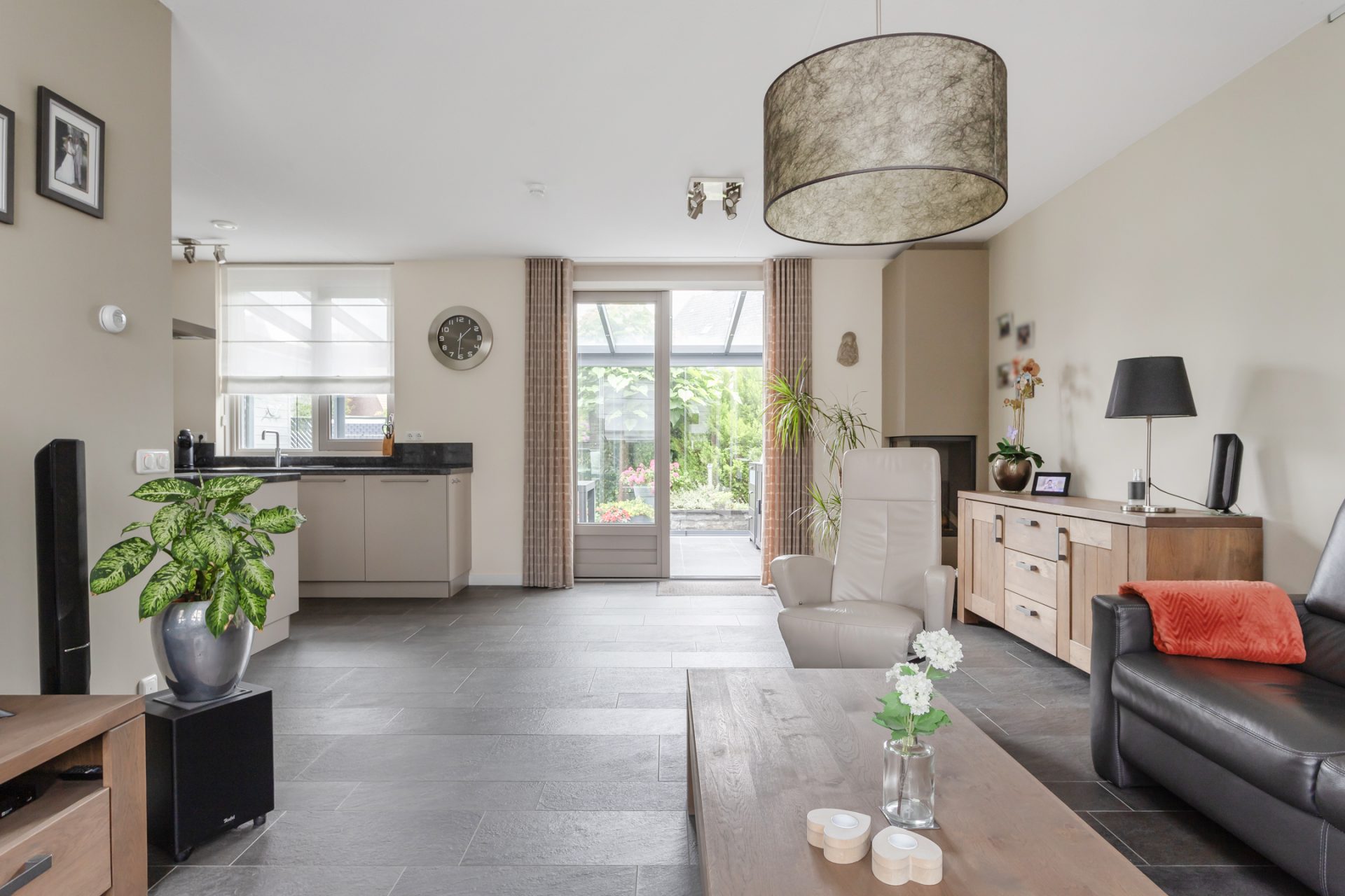 Vanuit de woonkamer bereik je via de tuindeuren de terrasoverkapping.