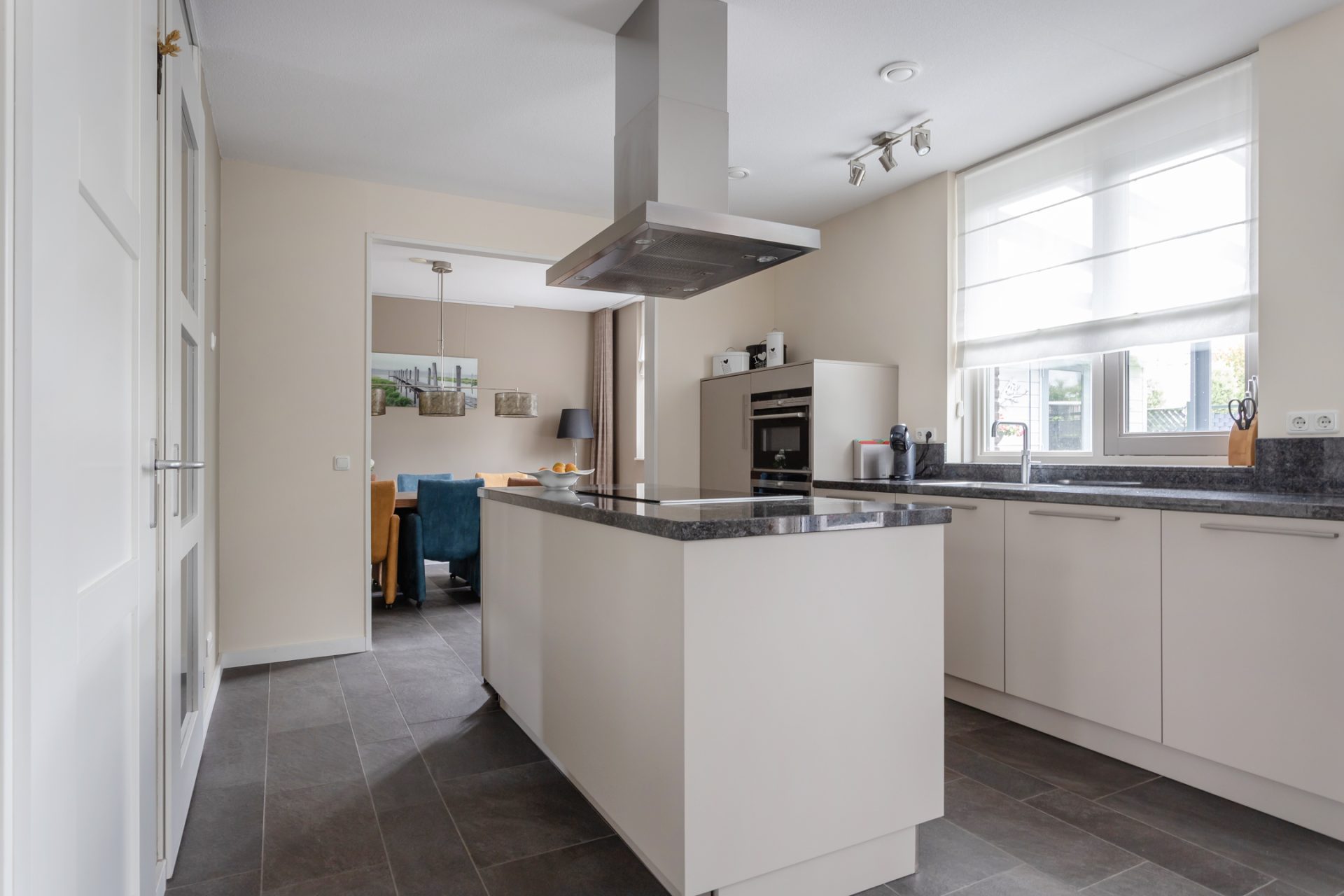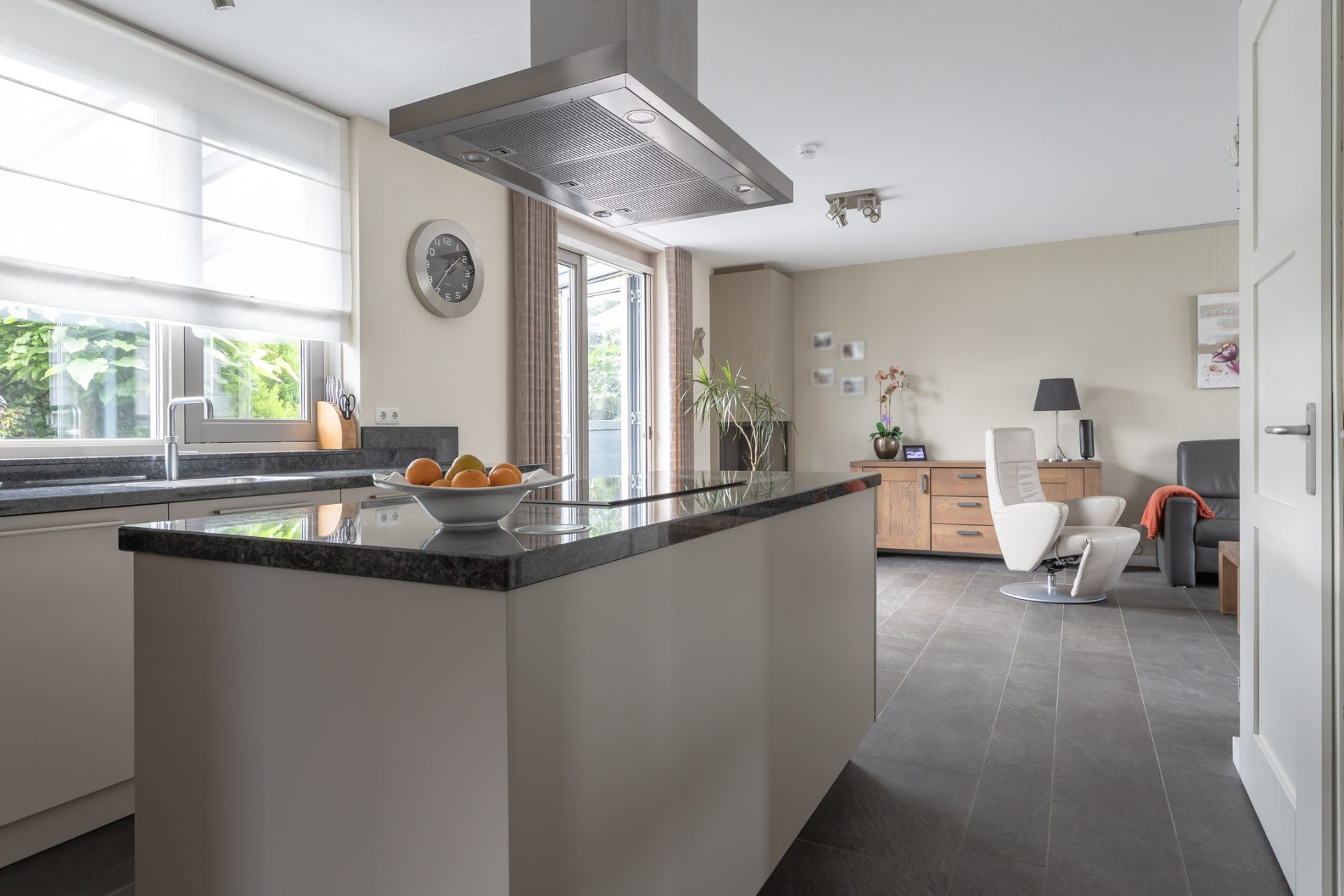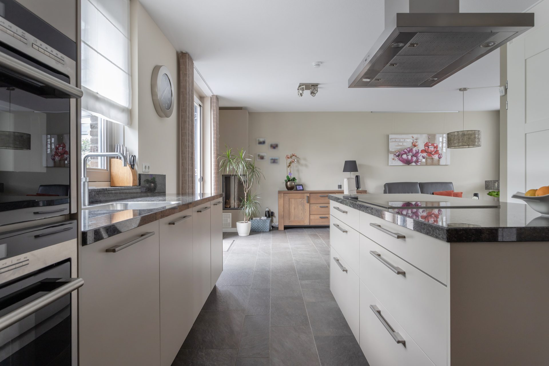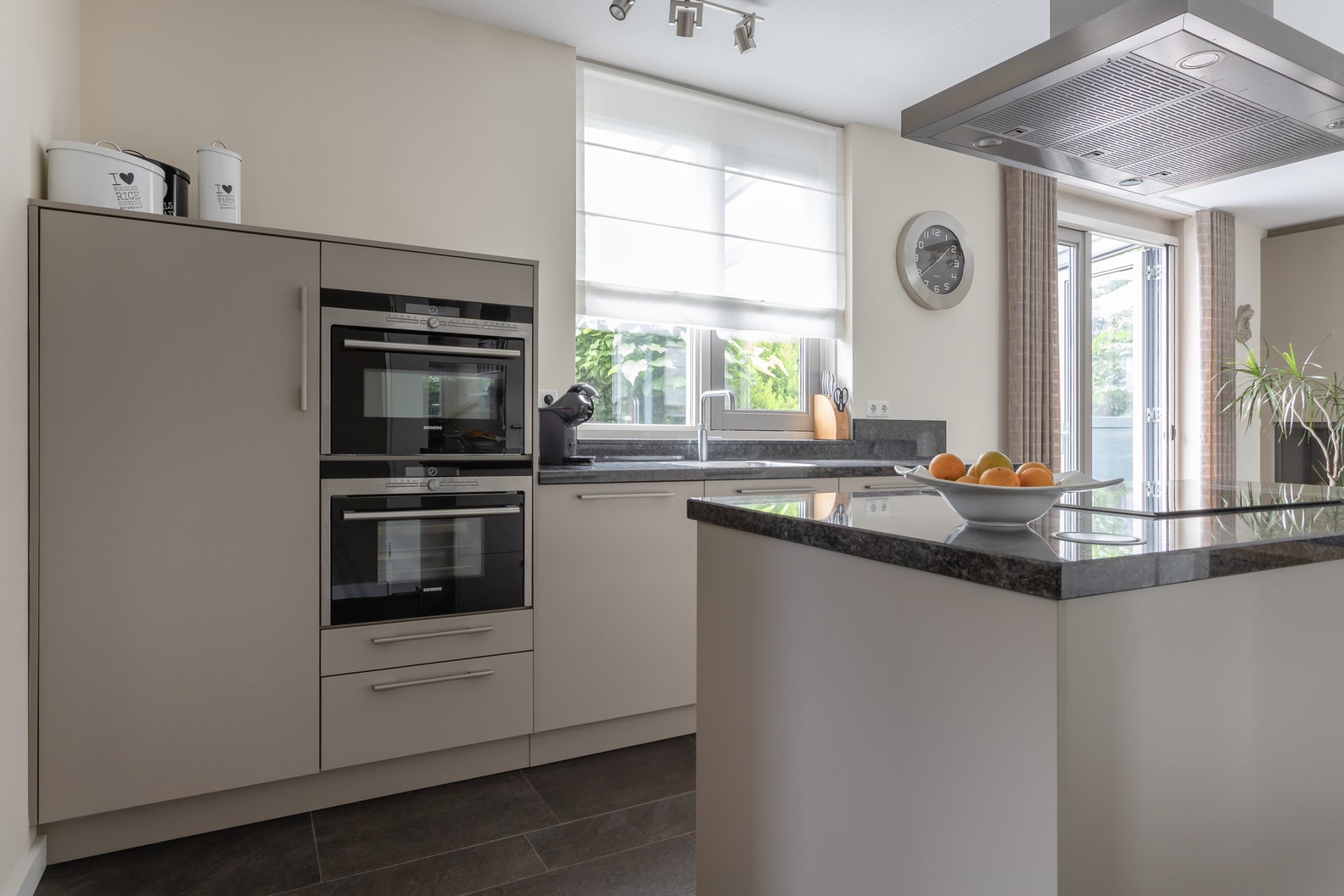 De keuken beschikt over een kookeiland en een keukenblok in lijnopstelling, is afgewerkt met een hardstenen blad en volledig uitgerust met inbouwapparatuur: Quooker, inductiekookplaat, afzuigkap, stoomoven, combi-oven, koelkast en vaatwasser.