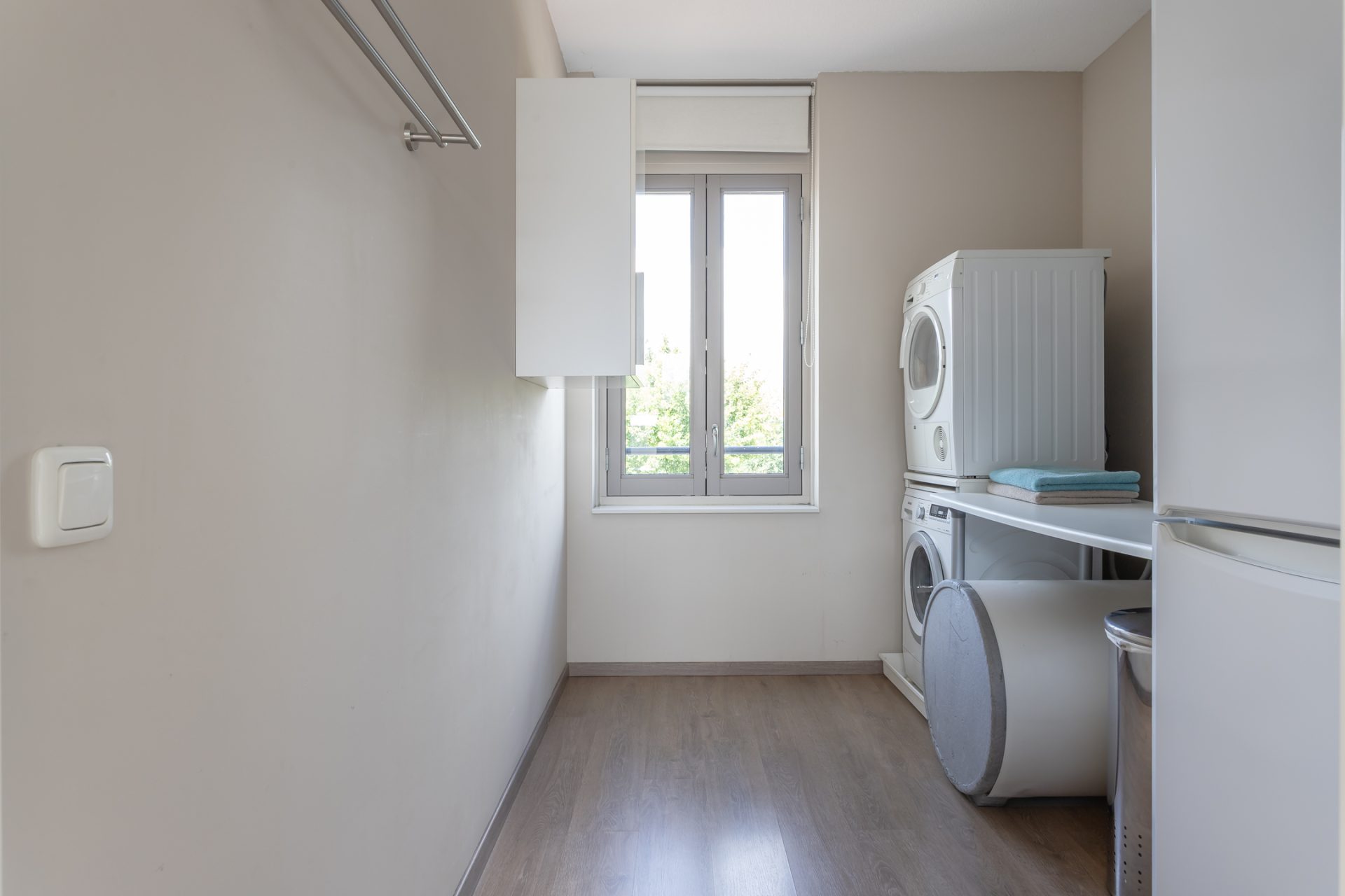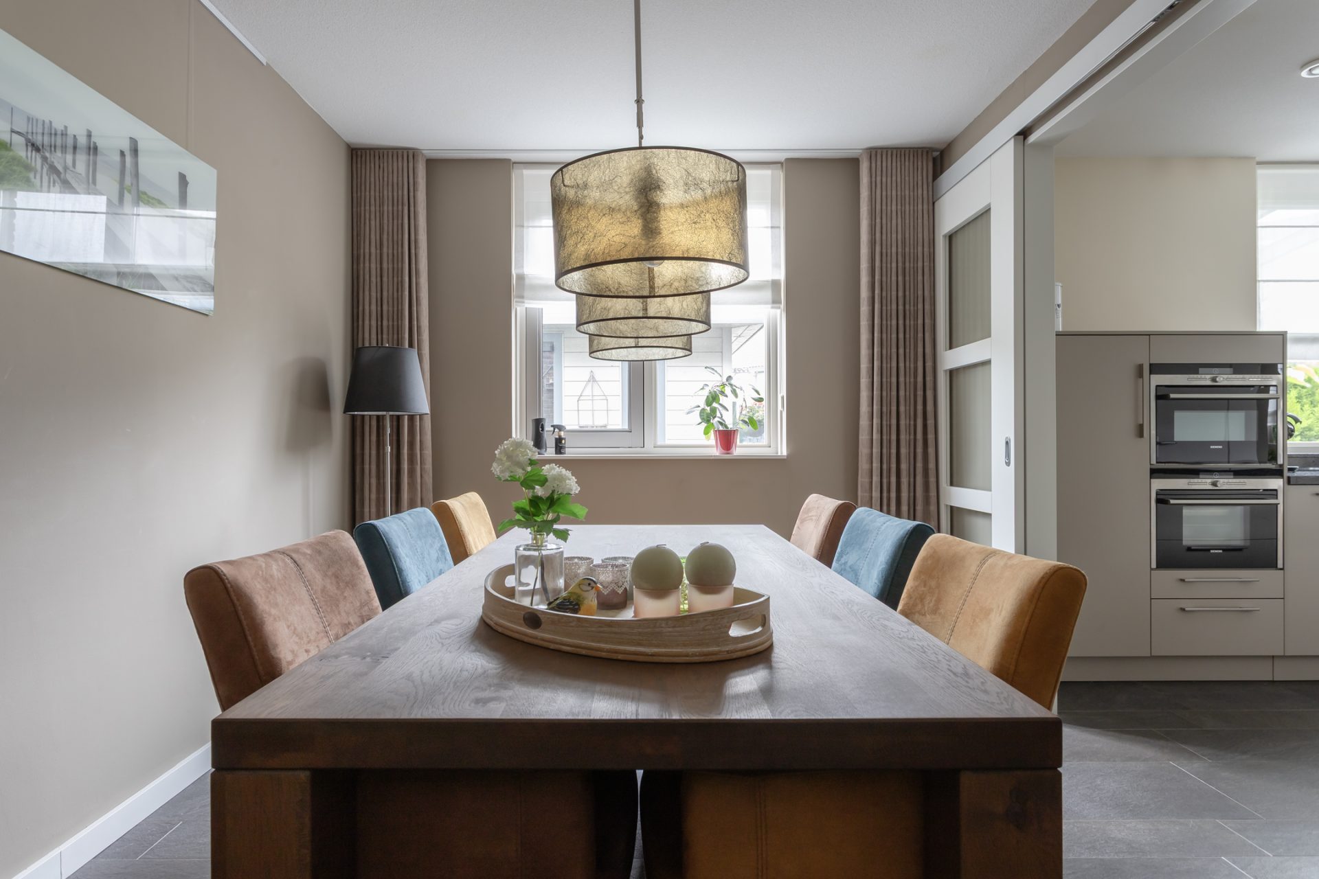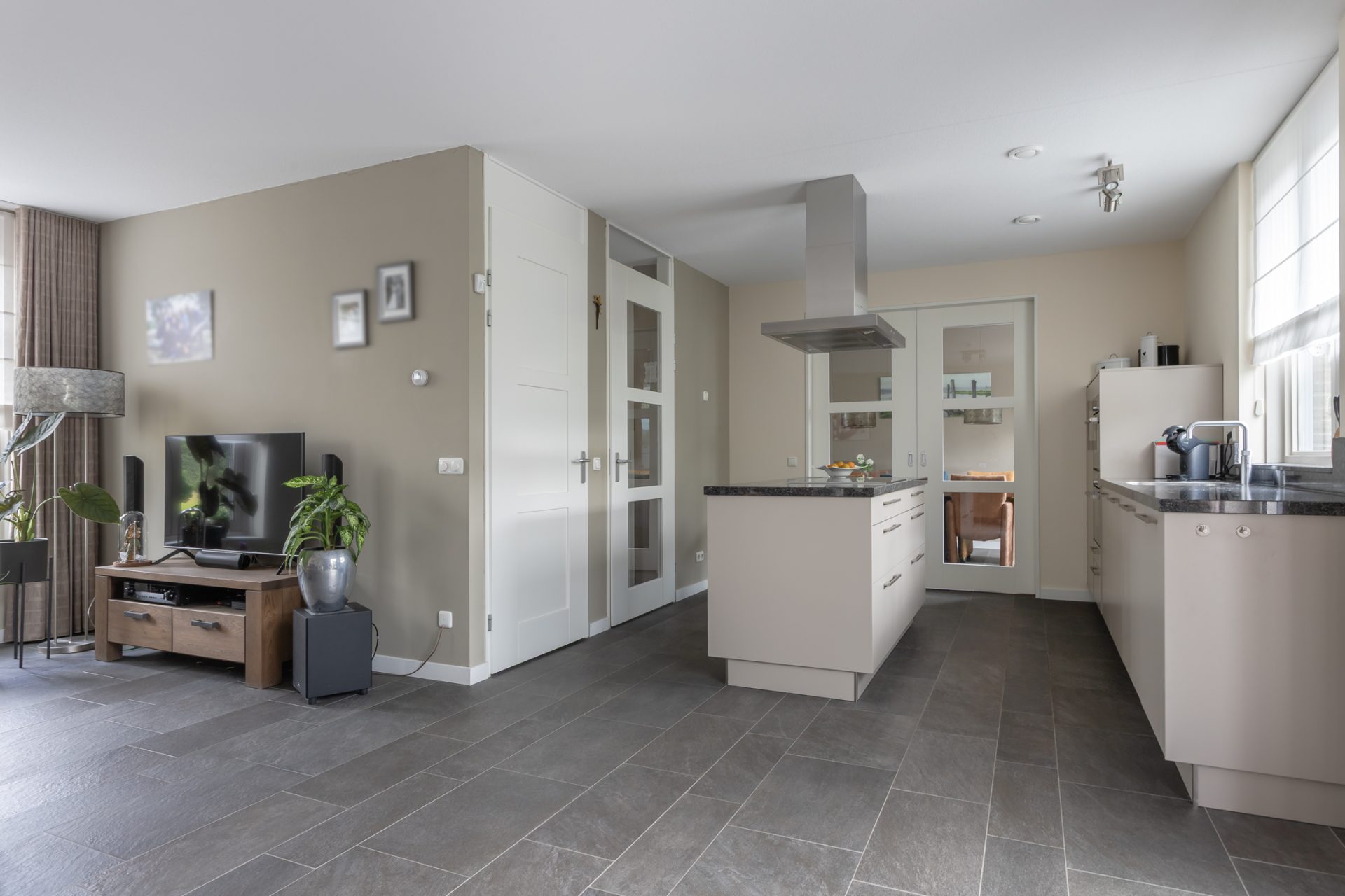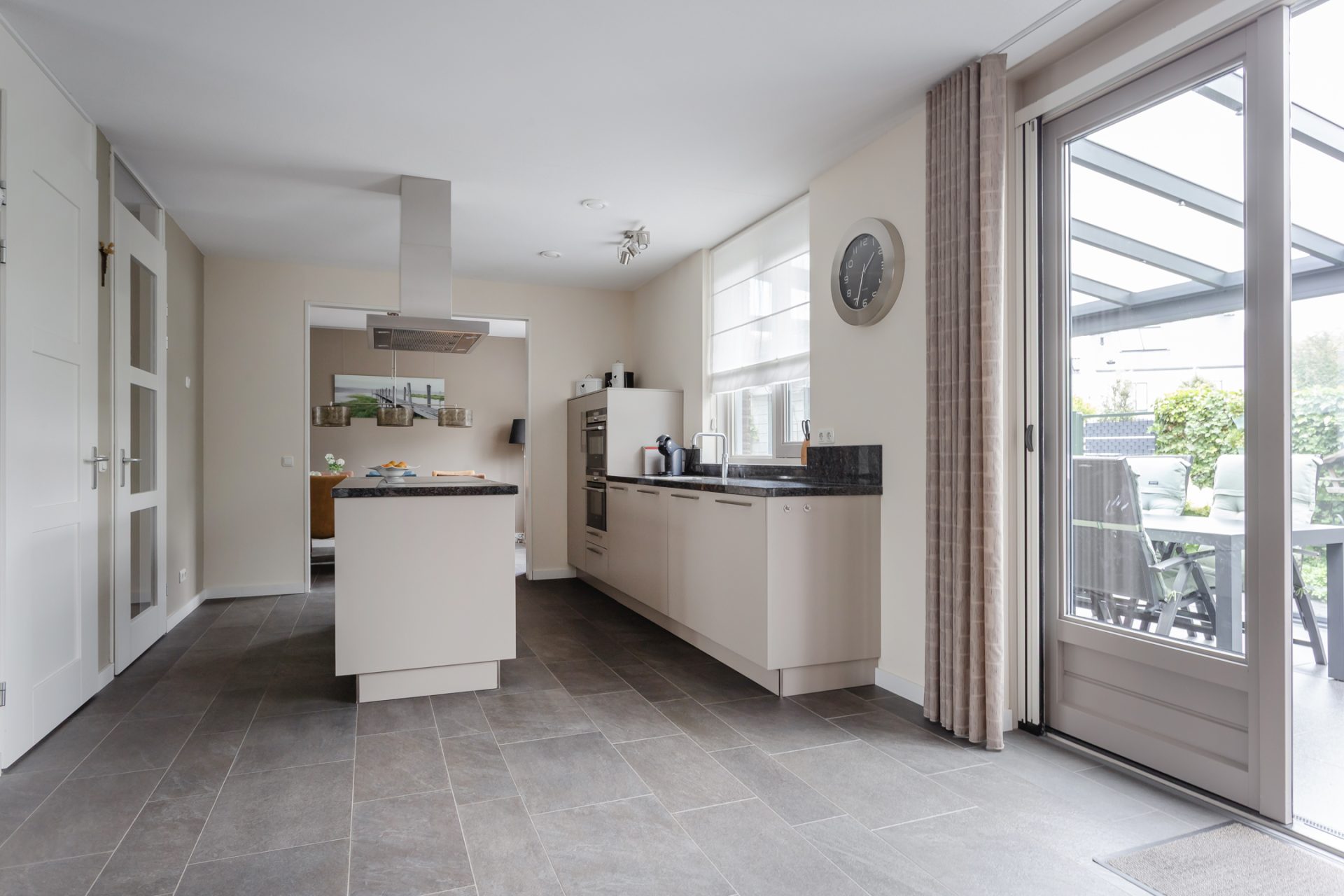 De keuken beschikt over een kookeiland en een keukenblok in lijnopstelling, is afgewerkt met een hardstenen blad en volledig uitgerust met inbouwapparatuur: Quooker, inductiekookplaat, afzuigkap, stoomoven, combi-oven, koelkast en vaatwasser.