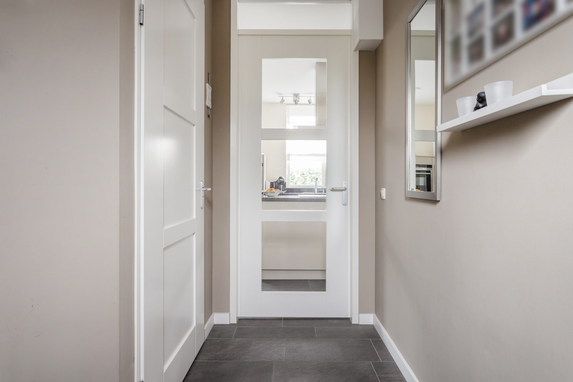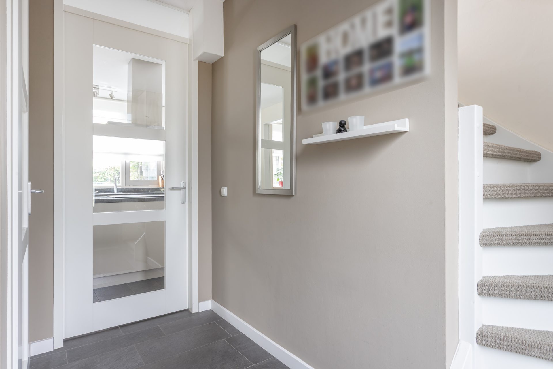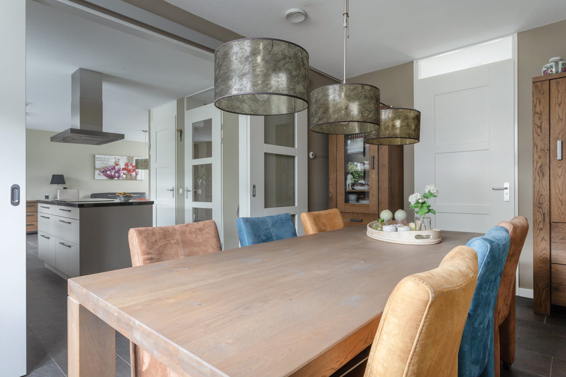 Entree/hal met het toilet, de meterkast en de trapopgang naar de eerste verdieping. De open keuken en de woonkamer zijn nu verbonden met een eethoek, die is afgescheiden met schuifdeuren. Oorspronkelijk was deze ruimte bedoeld als slaapkamer met aangrenzend de badkamer. Zo is het ook weer te gebruiken zonder enige aanpassing.