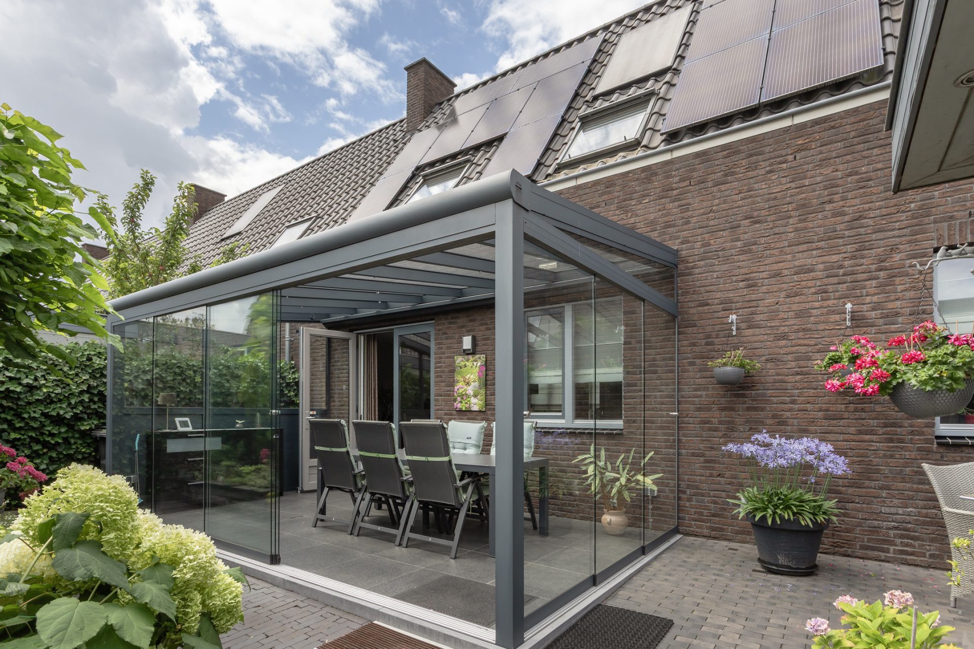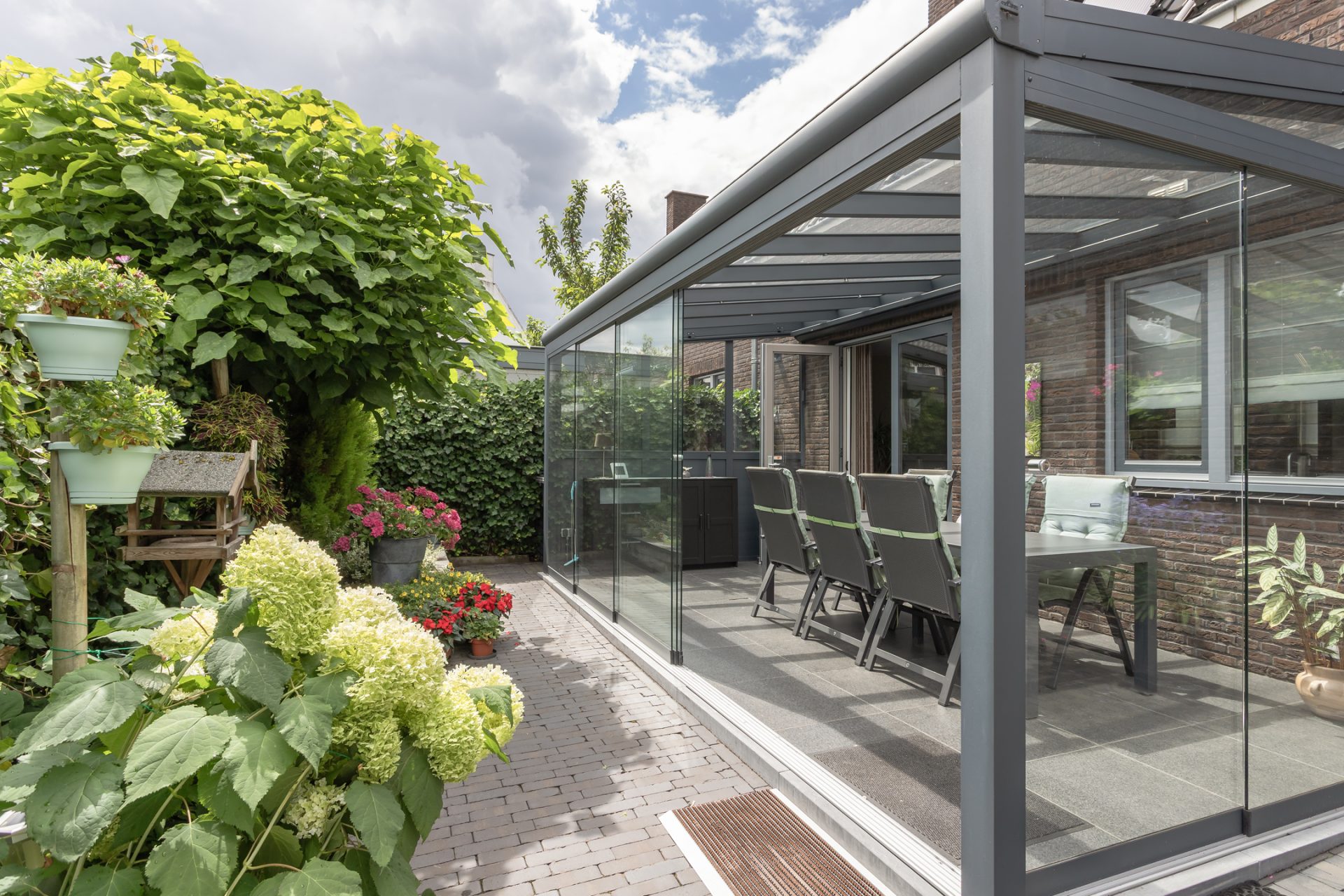 • Sfeervolle terrasoverkapping van het merk Verasol met glazen schuifwanden (ca. 16 m²)